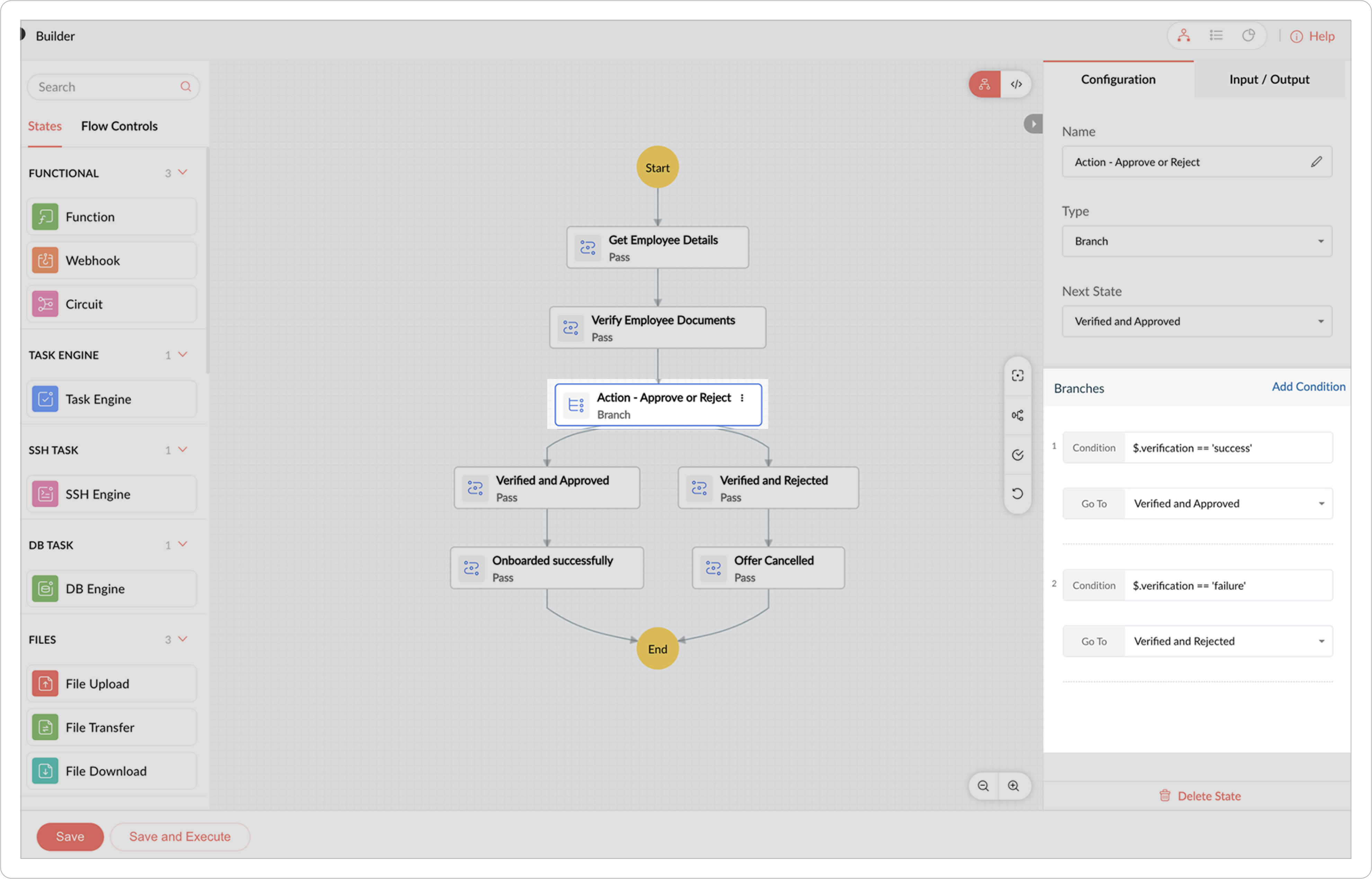 Use Case Example: In the case of employee onboarding, after the employee details are provided, the submitted documents undergo verification. To handle appropriate action after verification, the Branch state can be employed based on the input received. If the verification status is determined as 'success', the circuit will proceed to the next pre-configured state. On the other hand, if the verification status is identified as 'failure', the circuit will follow a different path to the configured state.