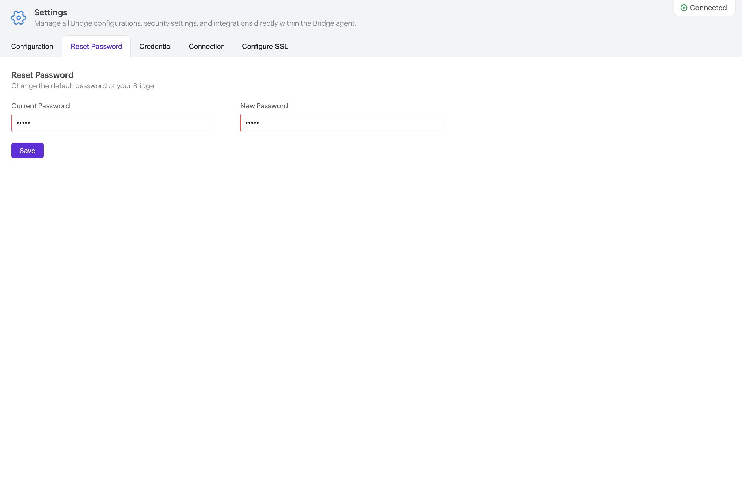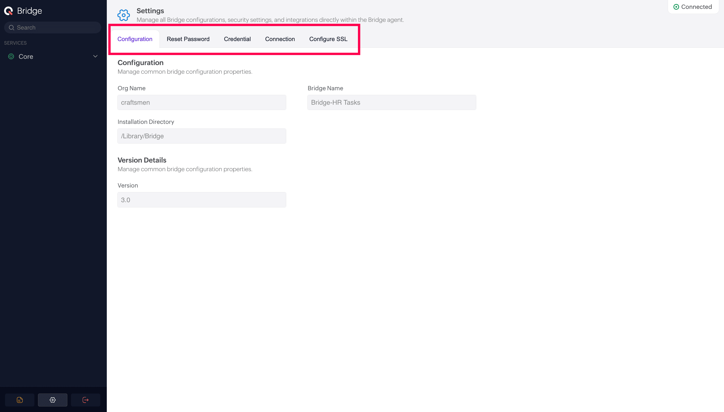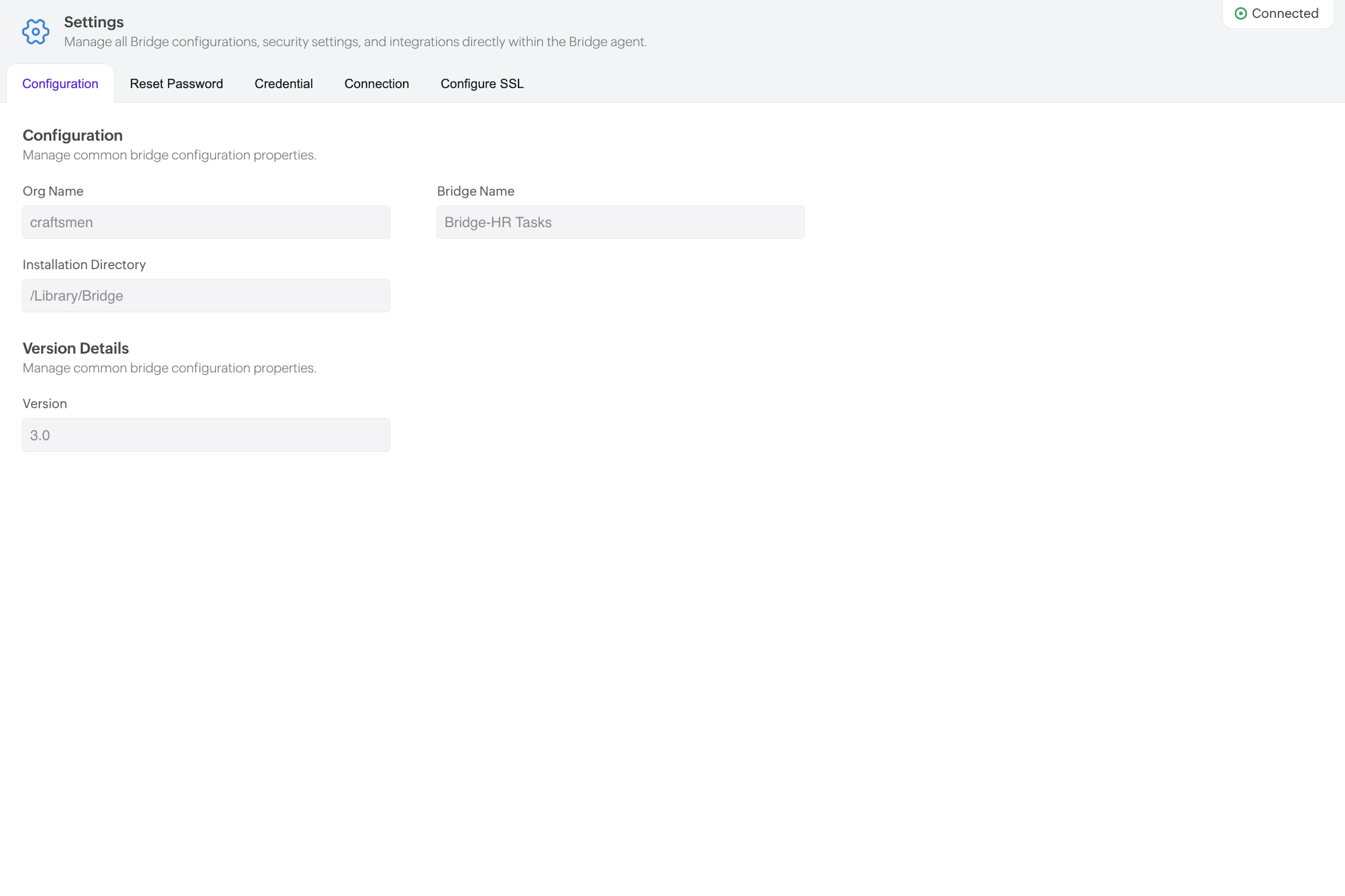 The connection status of the Bridge Agent is displayed at the top-right corner of the page.