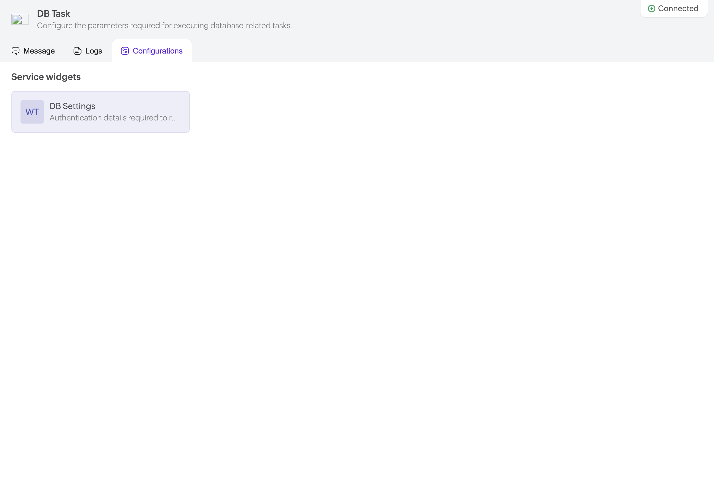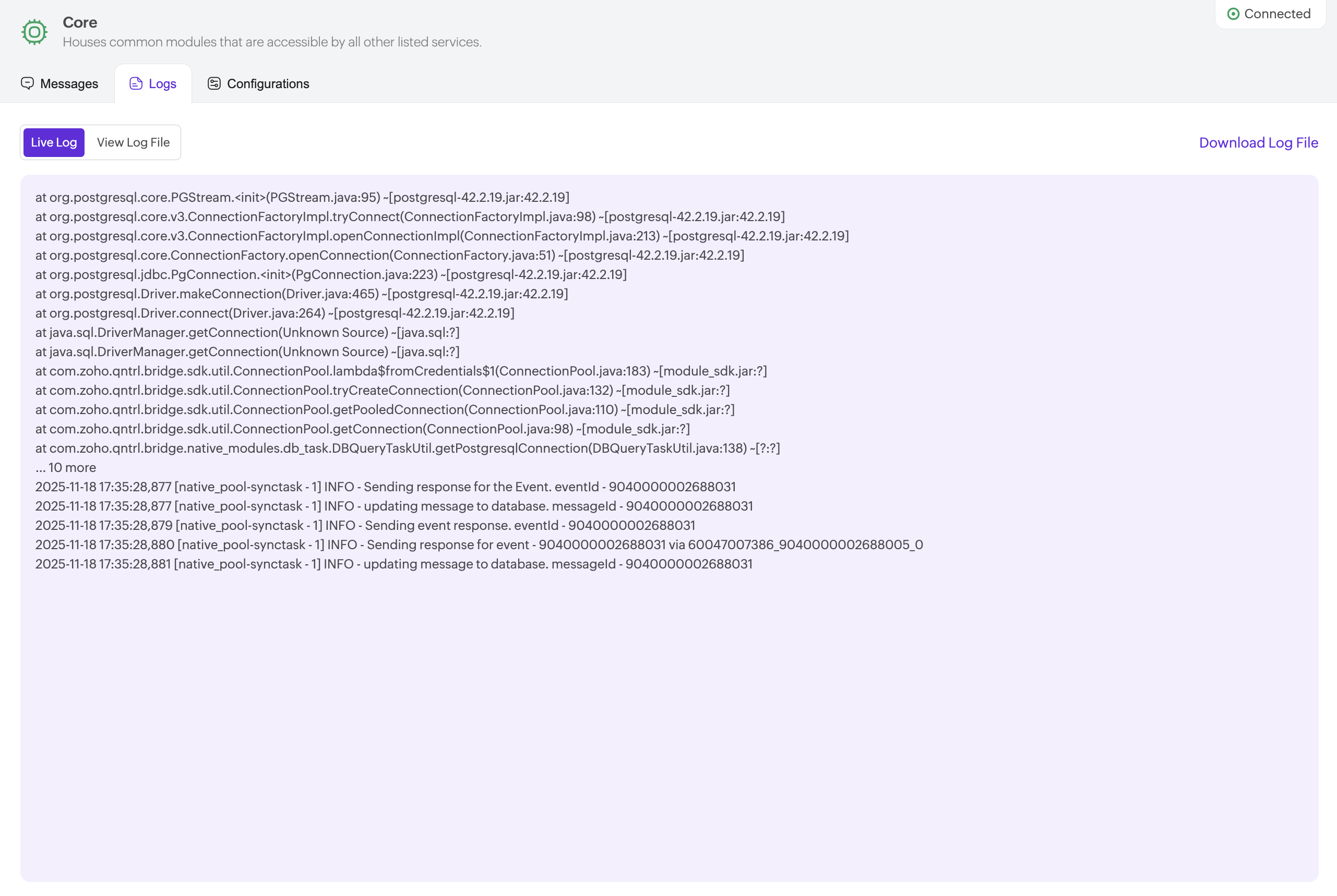 Each service contains three main sections: Messages, Logs, and Configurations.