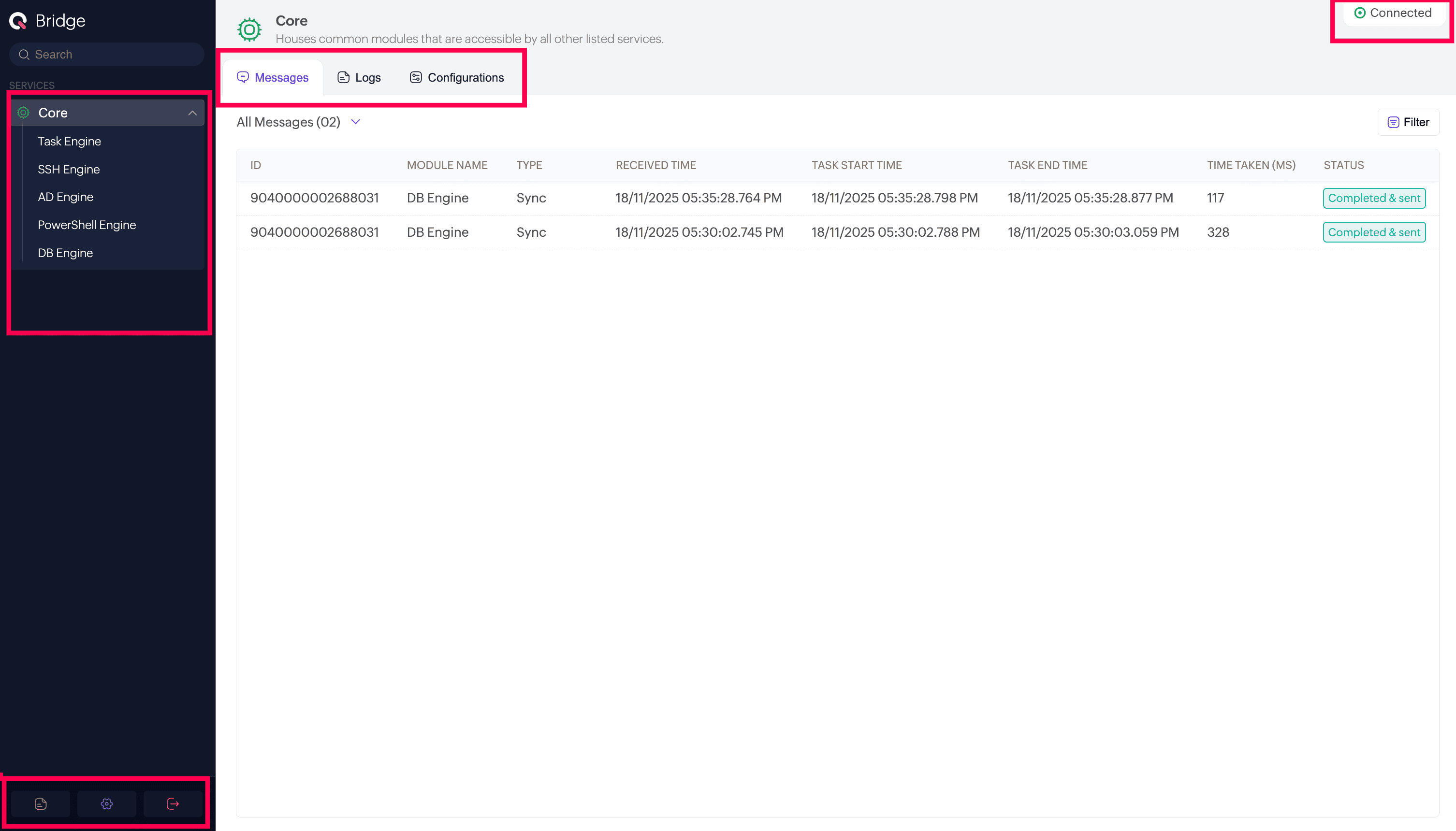 The Bridge Agent interface provides a centralized view of all services and modules connected to your Bridge.