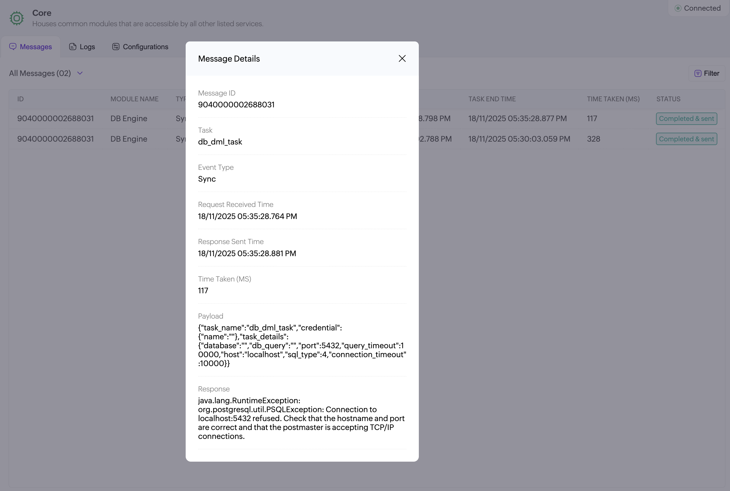 Click an ID to open its detailed view, which includes Payload (the request sent to Bridge) and Response (the result returned after execution).