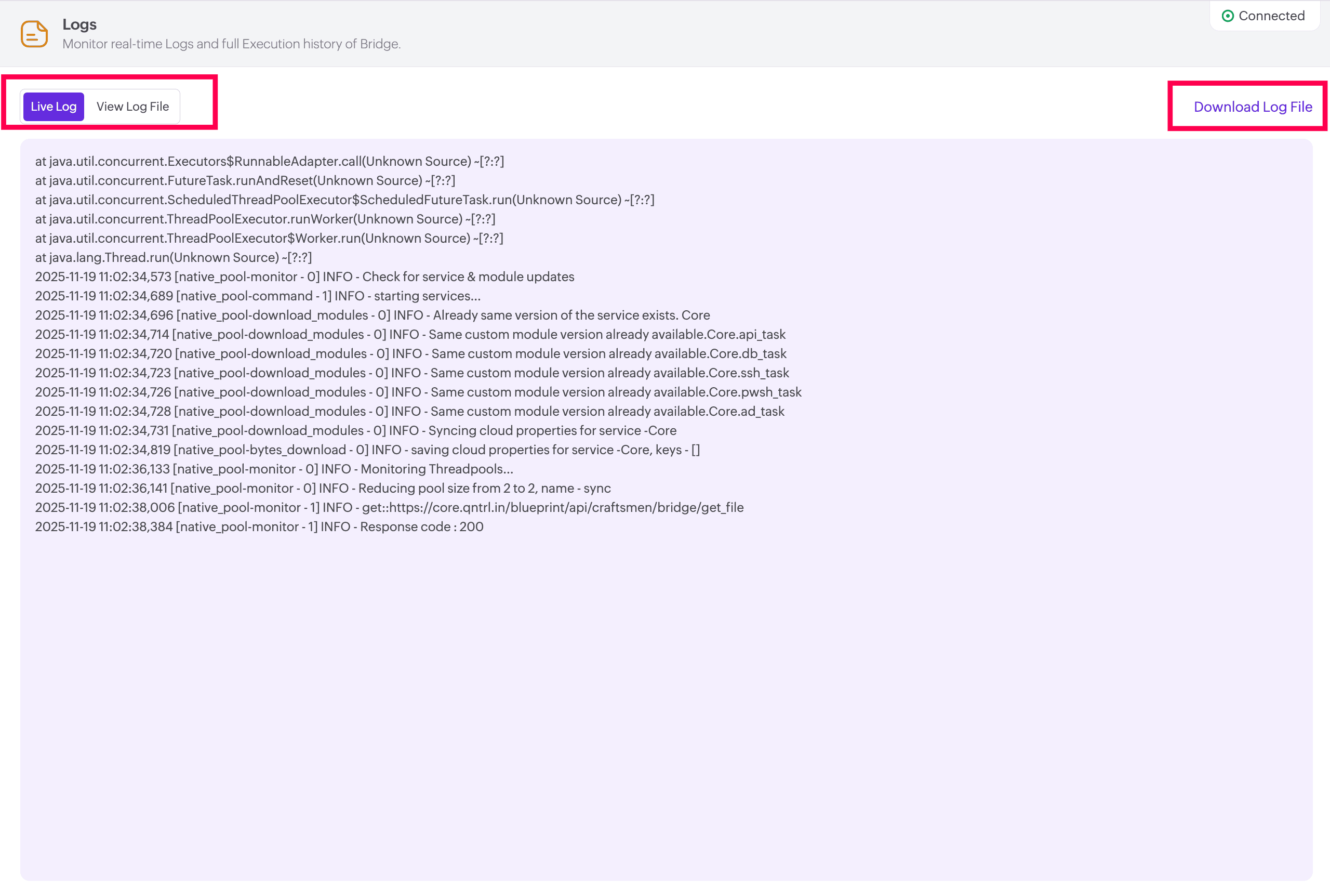 View consolidated logs generated by the entire Bridge.