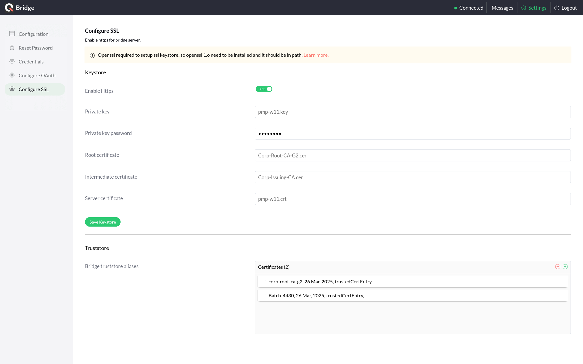 Click Save Keystore. The bridge will restart in HTTPS mode.