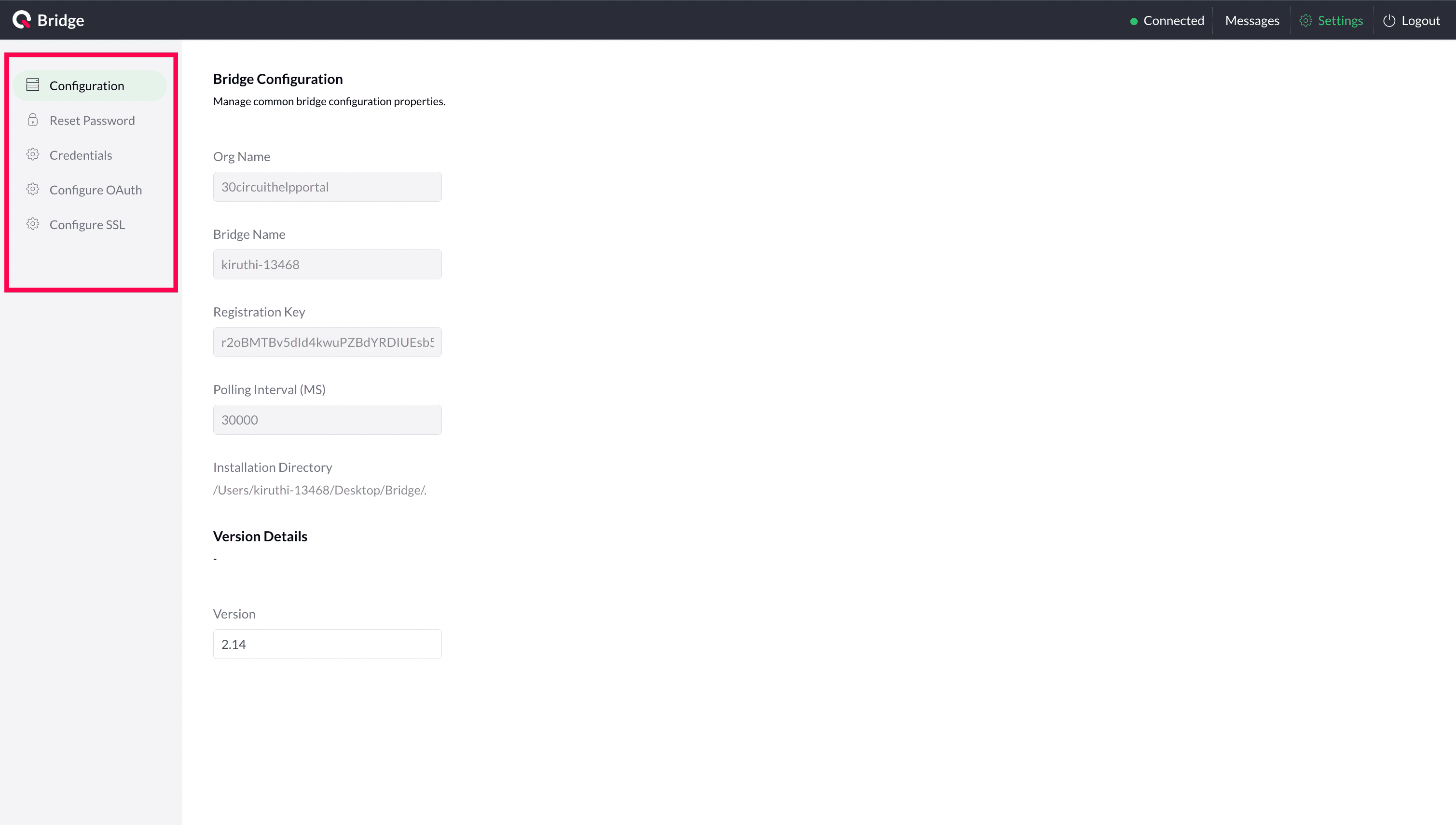 Bridge Configuration: Displays details such as Organization Name, Bridge Name, Registration Key, Polling Interval, and Installation Directory.