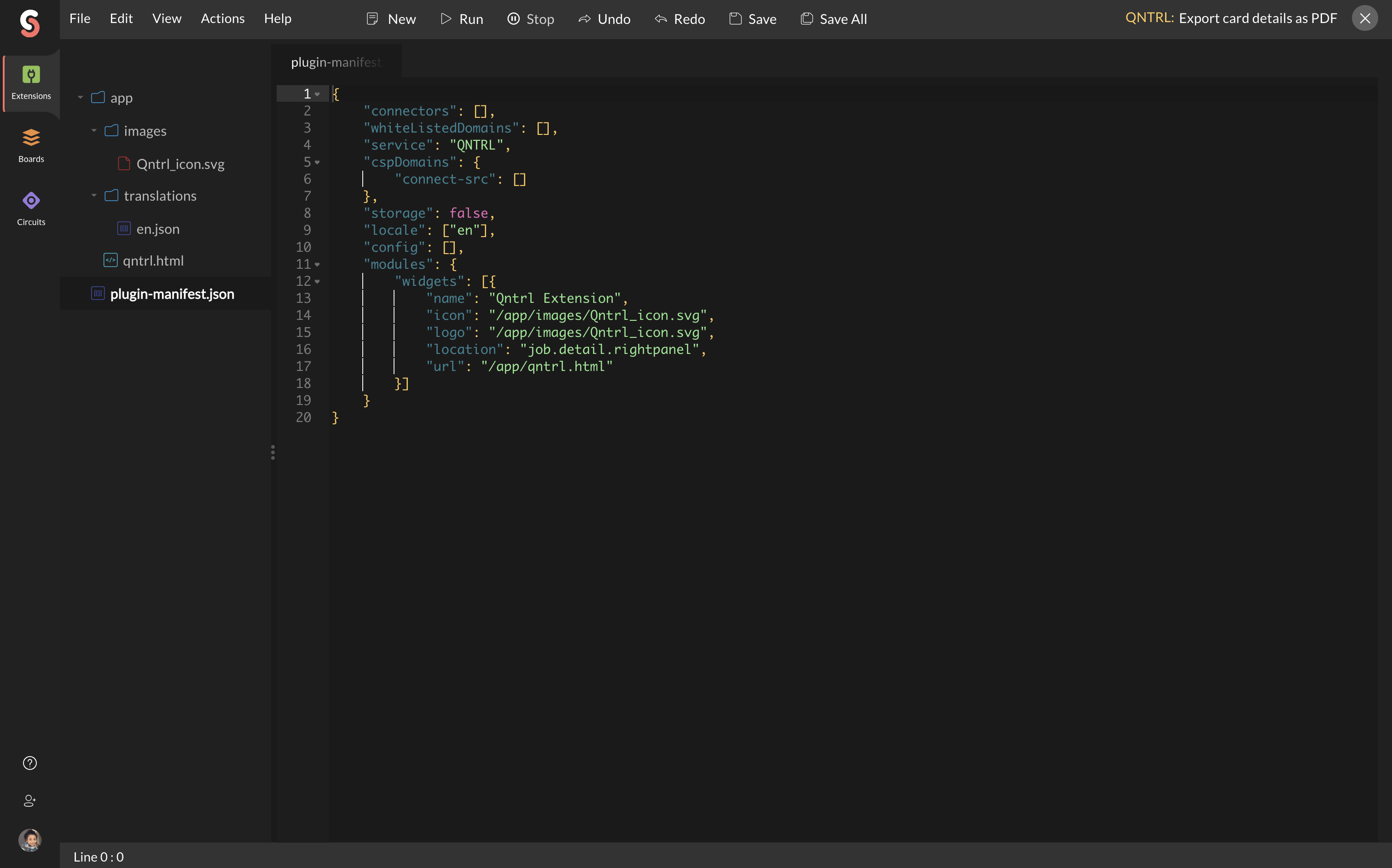 - Run: Click Run to execute the extension in Qntrl. You will be redirected to a new page where the extension will be loaded in the mentioned location. Changes made in the code will reflect immediately on the extension.