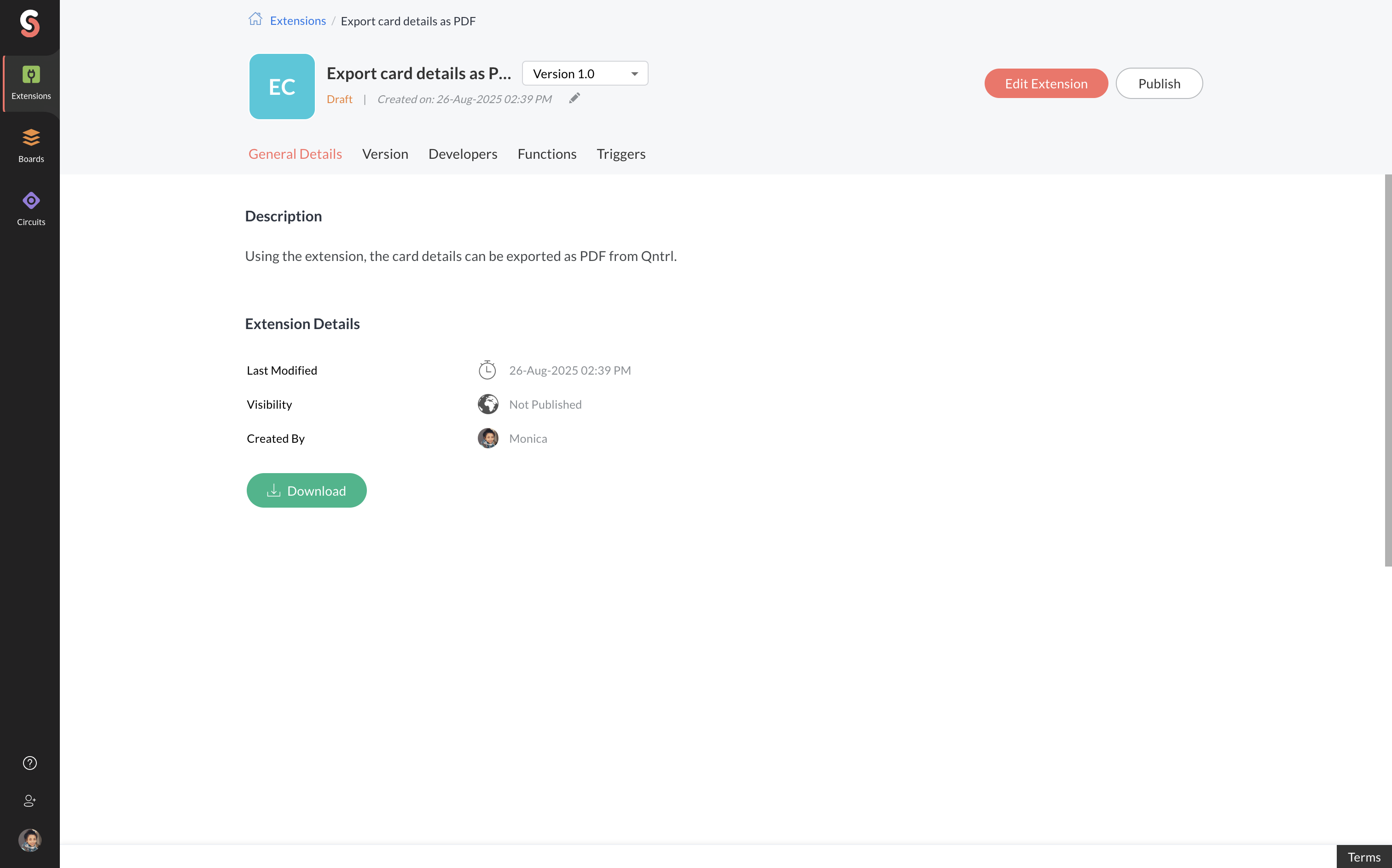 Public extensions go through a review process by our team of Qntrl Marketplace experts who validate your extension. Once validated successfully, the extension gets listed in Qntrl Marketplace. Get a detailed insight on the review process.
