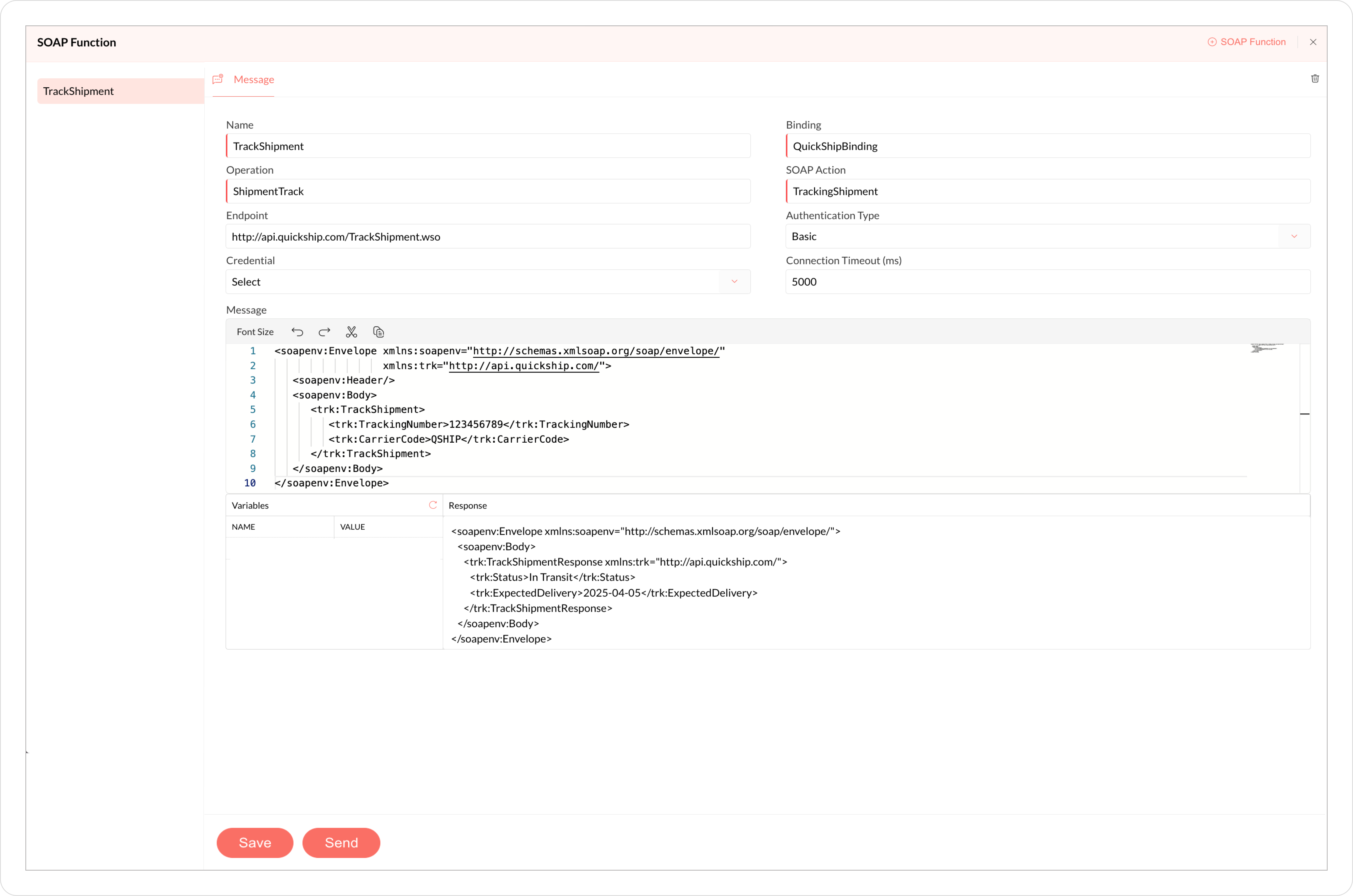Qntrl executes the TrackShipment function by sending a SOAP request to QuickShip’s tracking API.