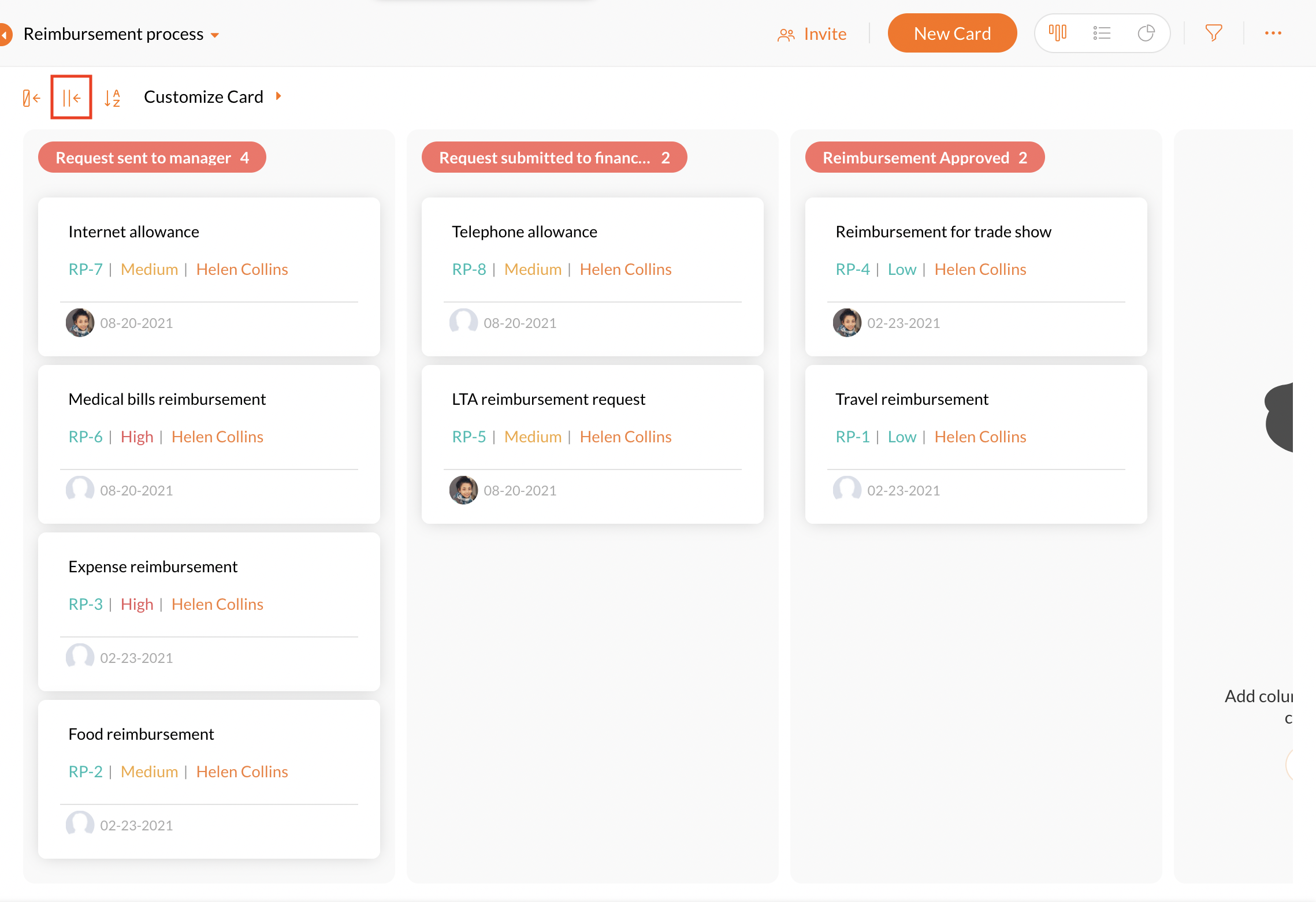 All the stages in the Kanban view will be in expanded state by default. However, you can collapse stages and expand them anytime as needed.