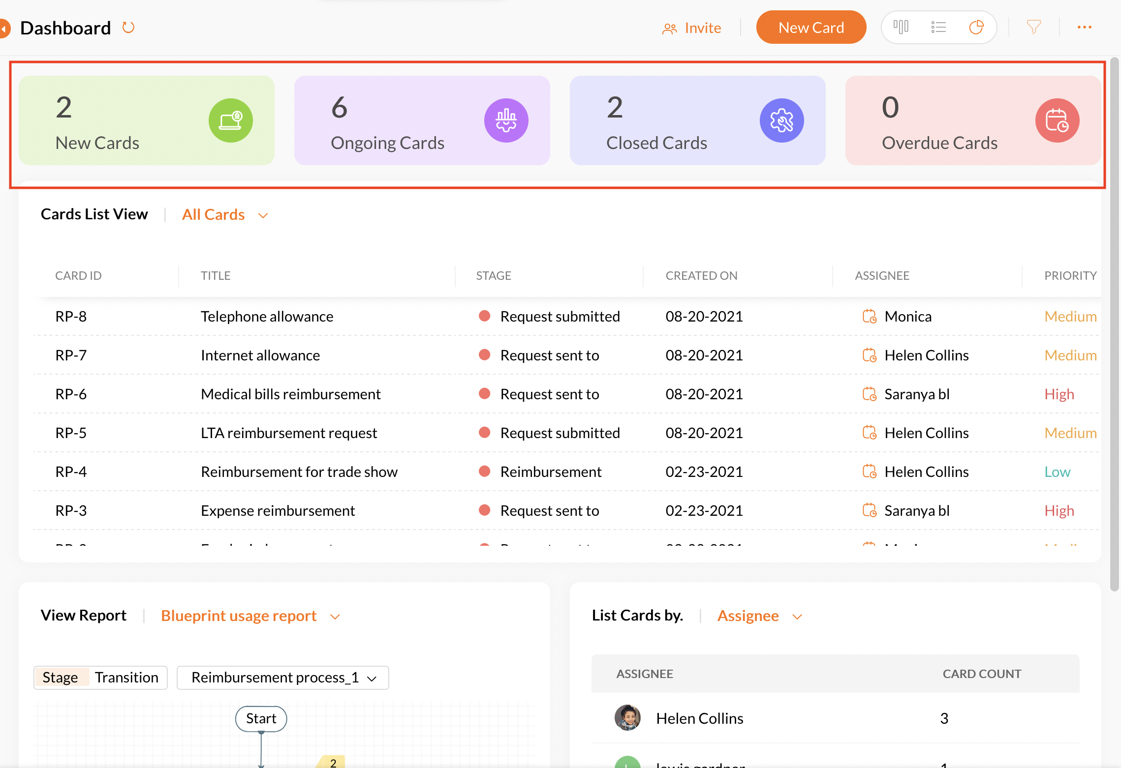 A total of four tiles will be displayed under this category. Each tile comprises of the total count of cards under each category. Cards are summarized and categorized as Not Started, Ongoing, Completed, and Overdue .