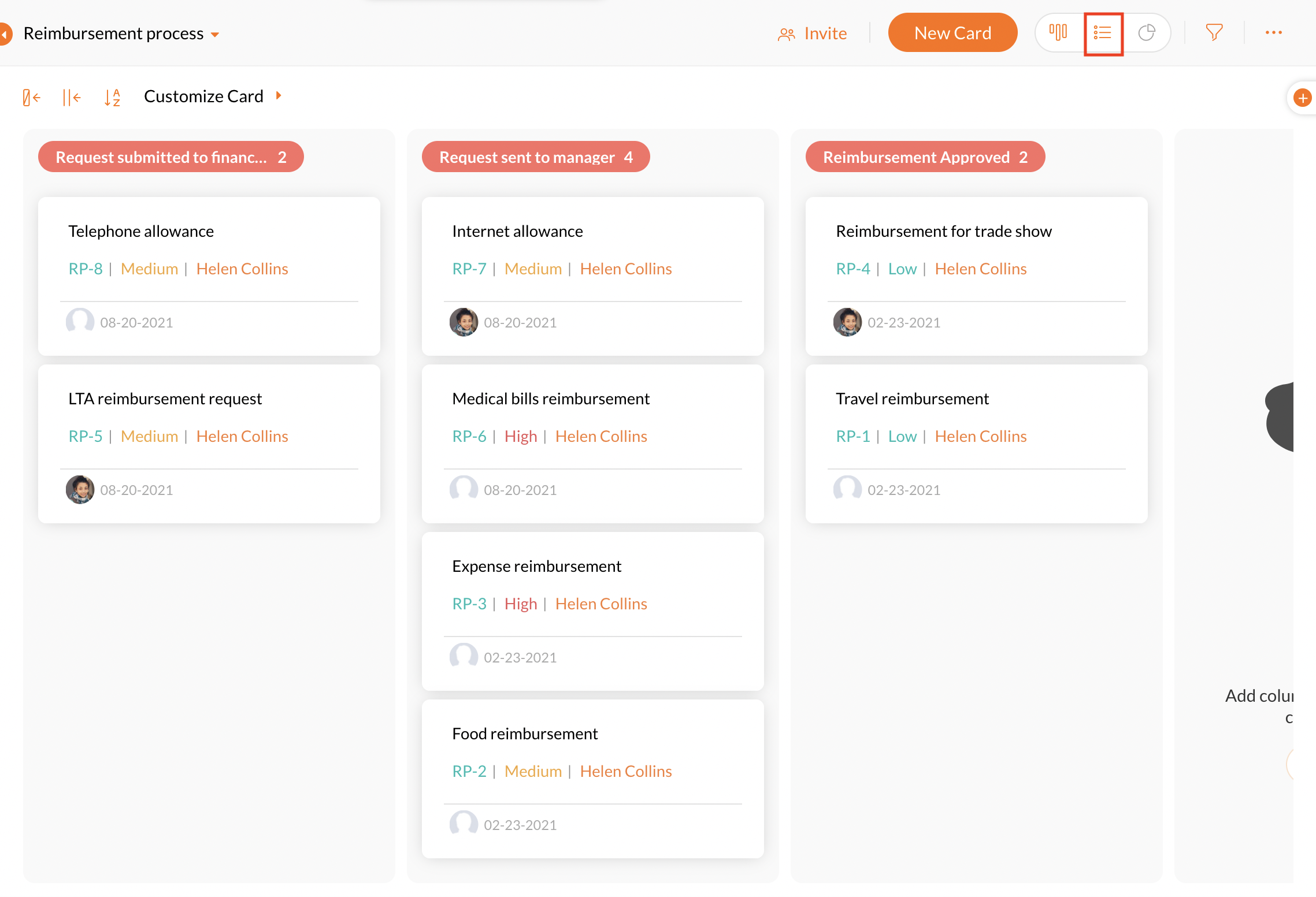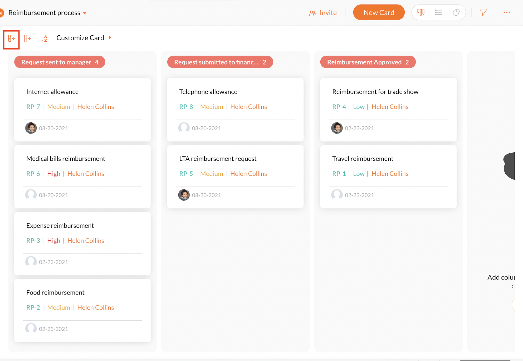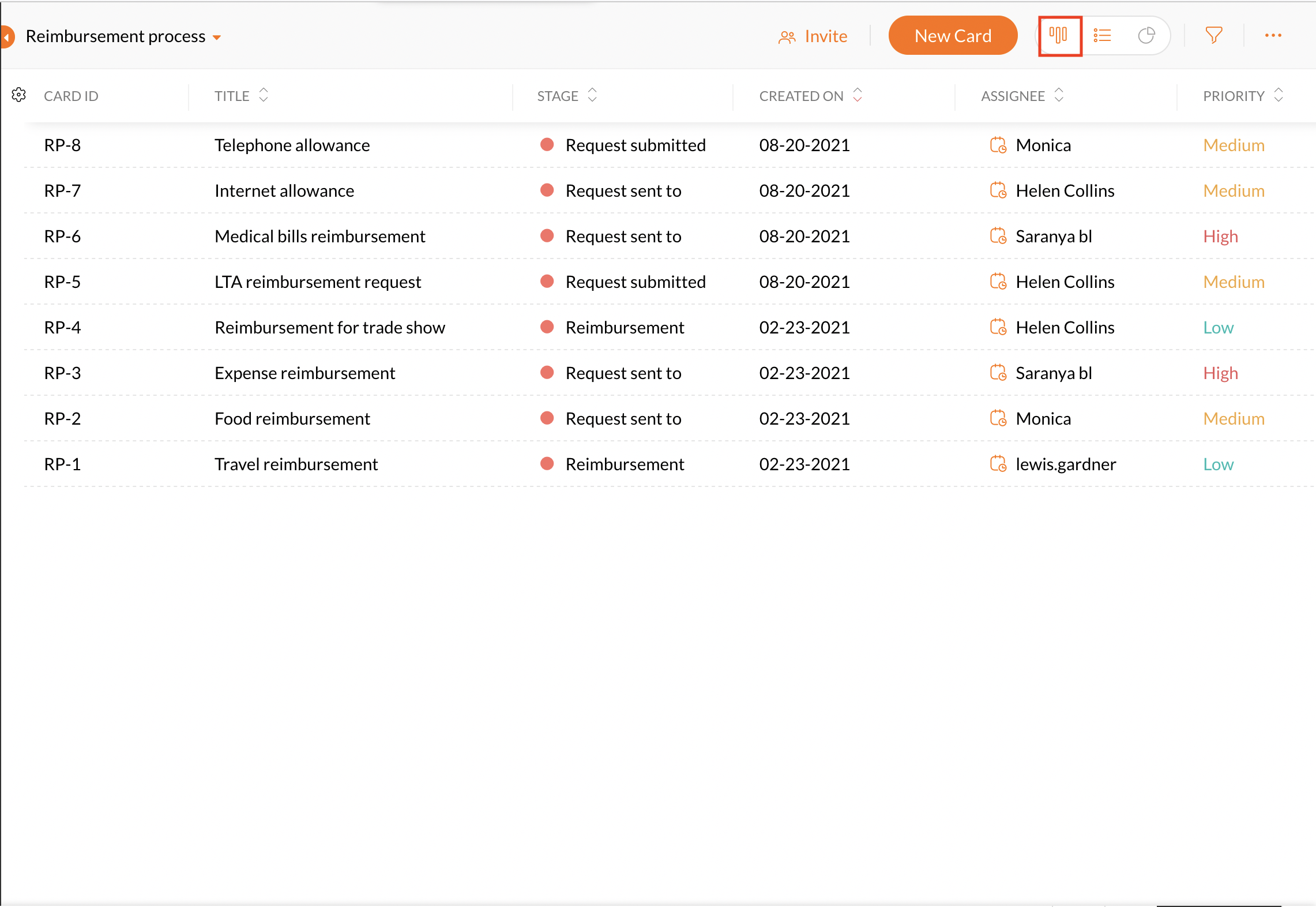 Visualize the cards mapped in different stages of a blueprint as columns using the Kanban view. In the Kanban view, each column is called a Kanban board. Cards are arranged in a Kanban board with each board representing a stage. Both default and custom stages will be displayed in the Kanban view.