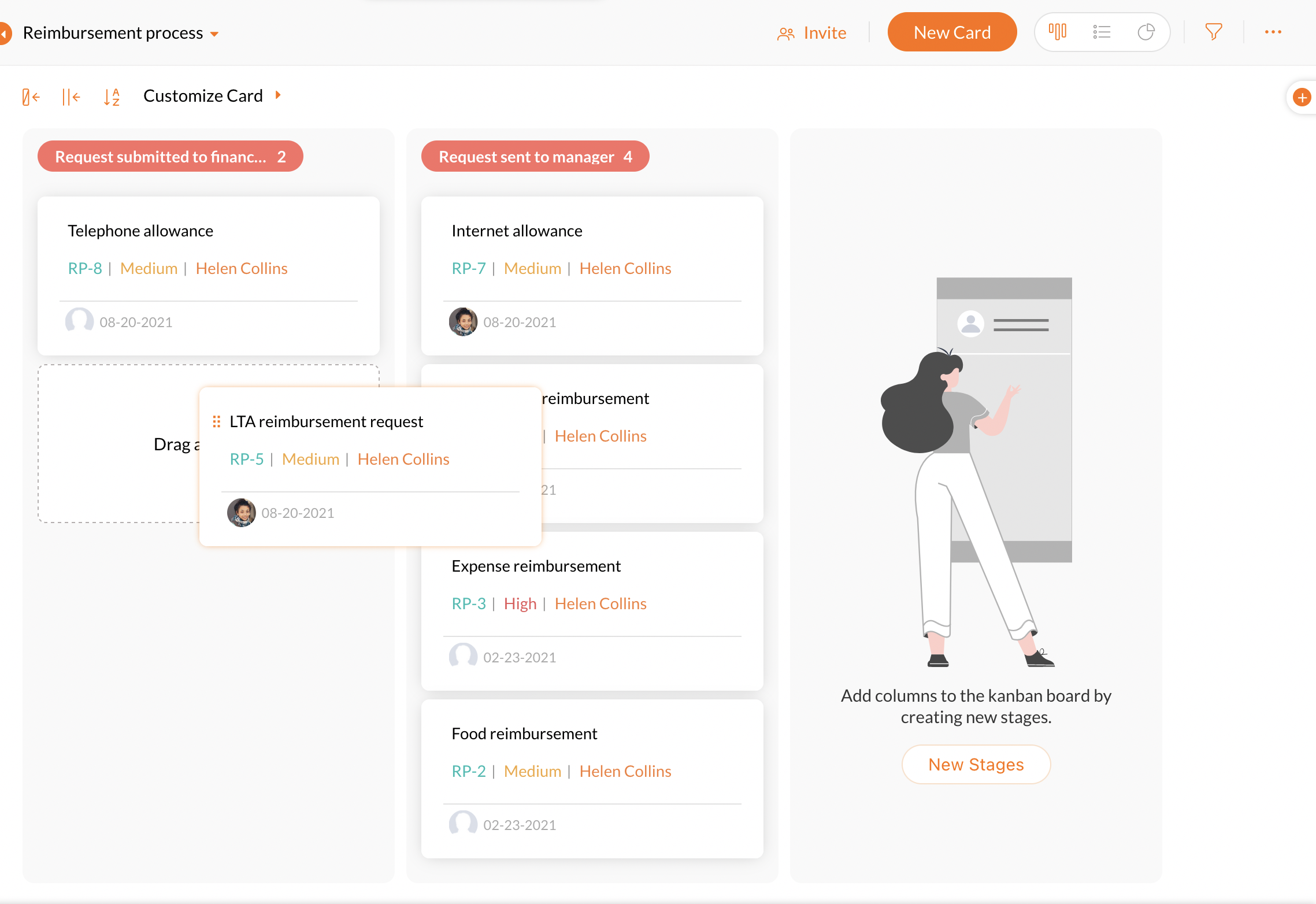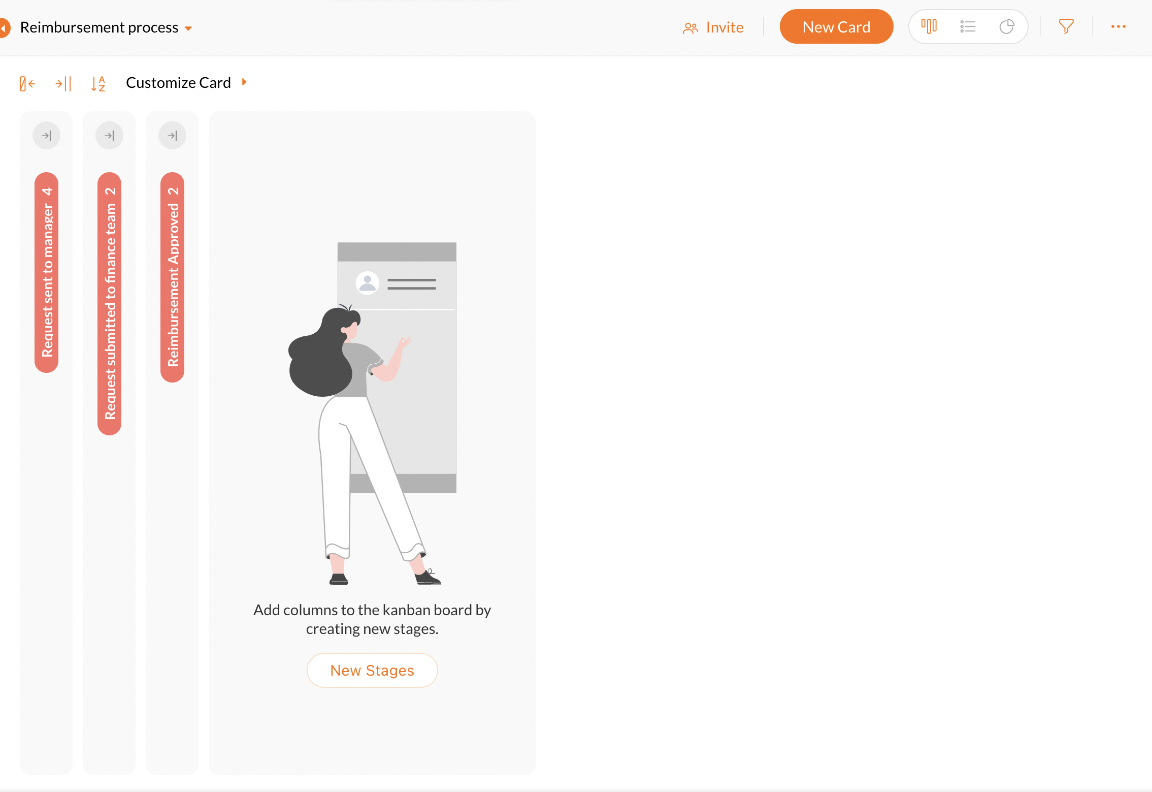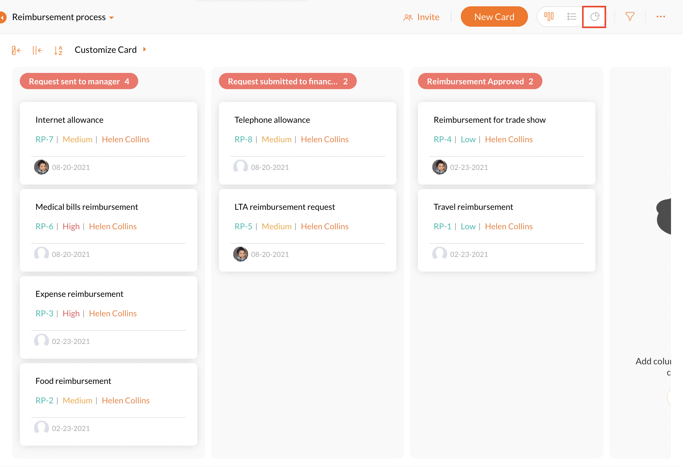 Visualize the cards mapped in different stages of a blueprint as columns using the Kanban view. In the Kanban view, each column is called a Kanban board. Cards are arranged in a Kanban board with each board representing a stage. Both default and custom stages will be displayed in the Kanban view.