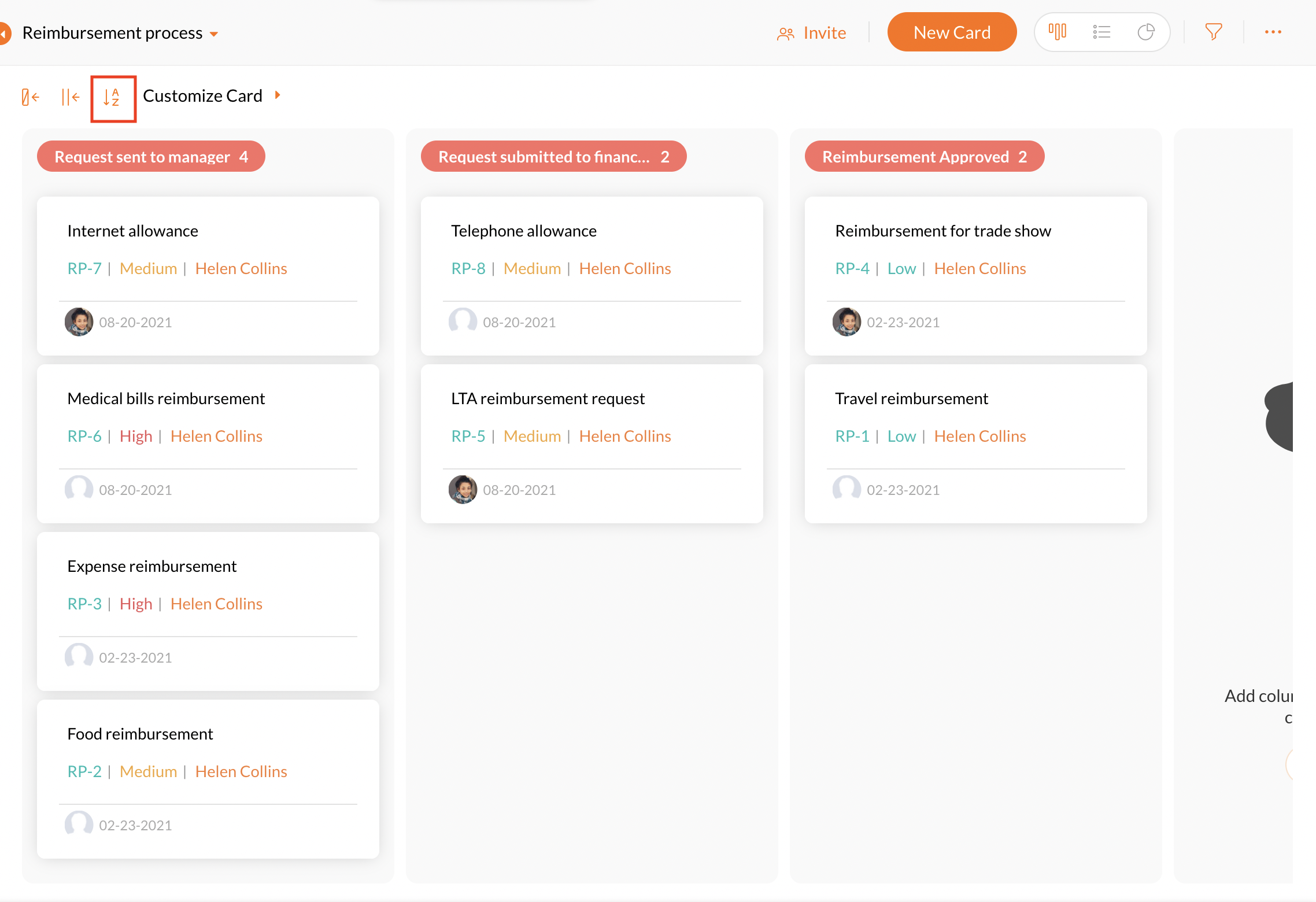 Sort cards to be displayed in each stage with a specific field in either ascending or descending order.
