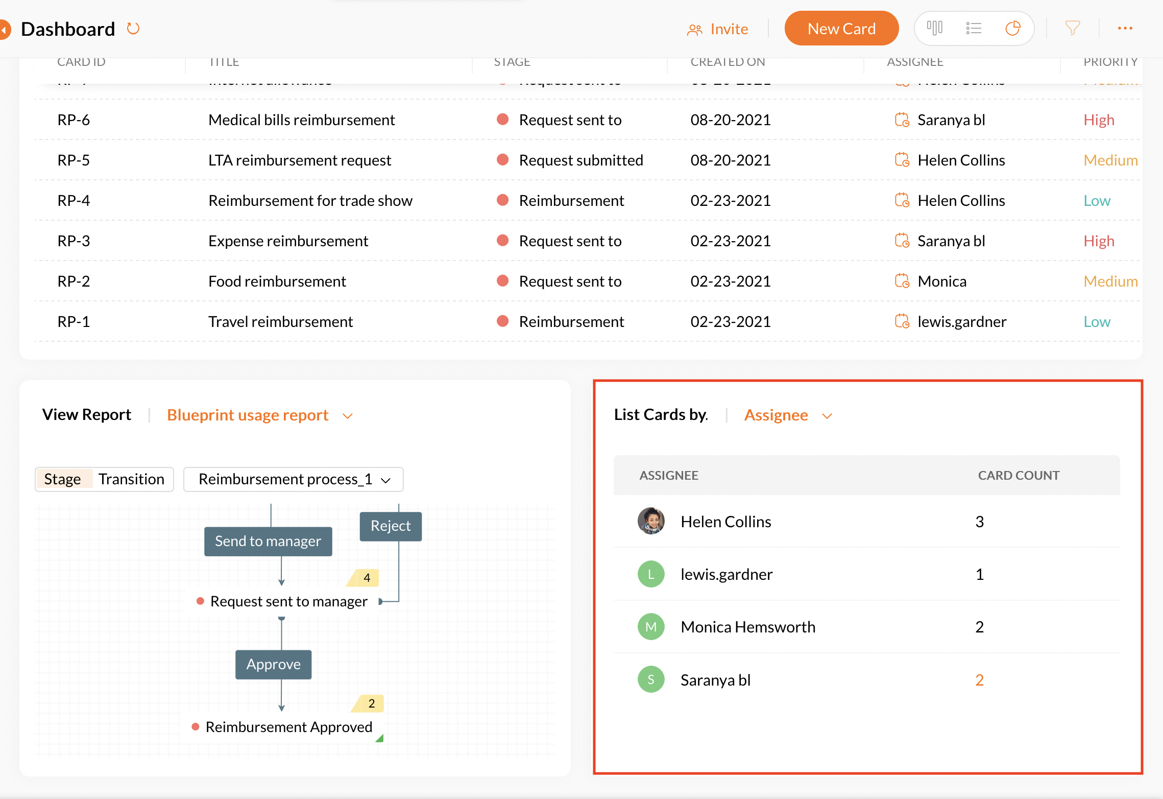 Take a broad view at your business activities within a Board using Dashboard. This will help with more insights on how to improve the business and work on strategies to achieve business targets at ease. This view displays the details of cards in the chosen board.