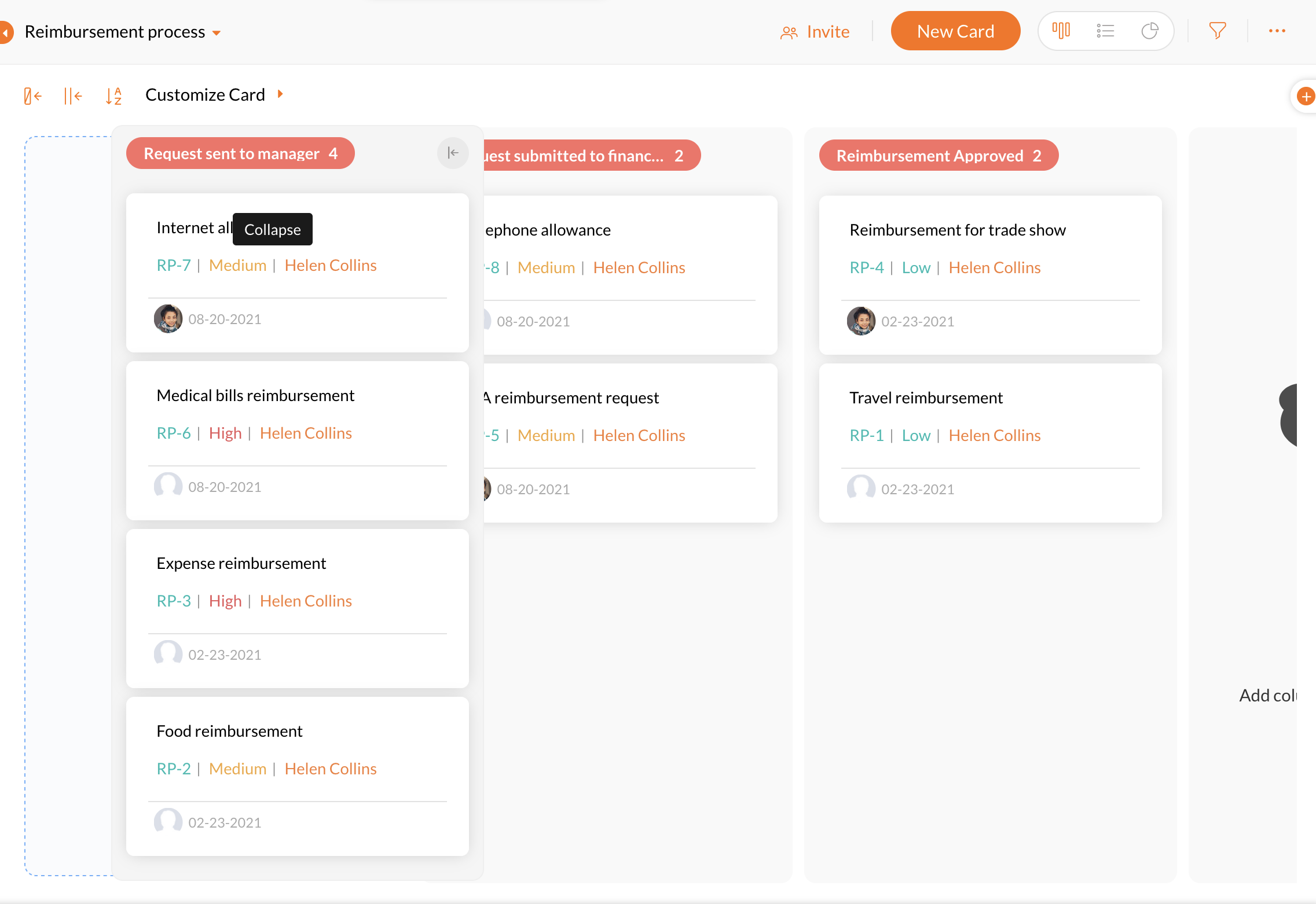 If you would like to view only the cards that are in a particular stage in kanban view and would like the rest of the stages to be hidden, you can click the collapse icon to hide those stages. You can expand them anytime you need by using the expand icon.