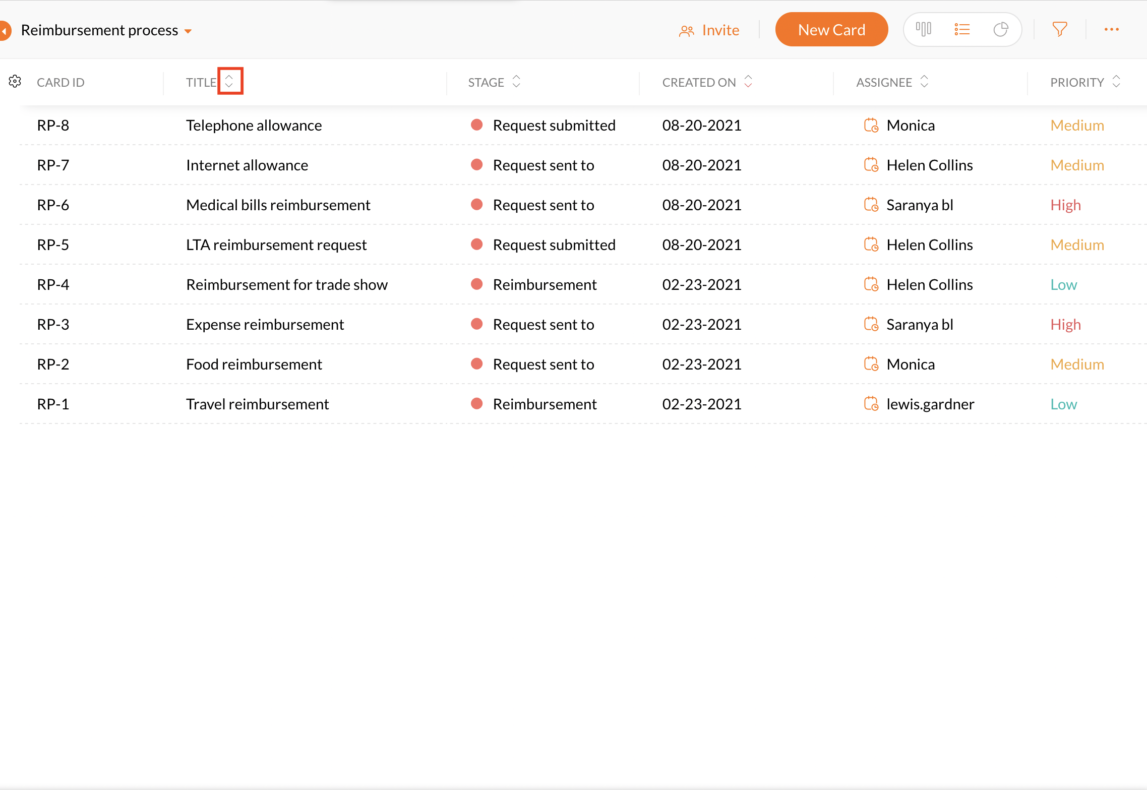 Cards can be sorted in ascending or descending order of fields. By default, the latest card created will be listed first. This option is available in List View of cards.