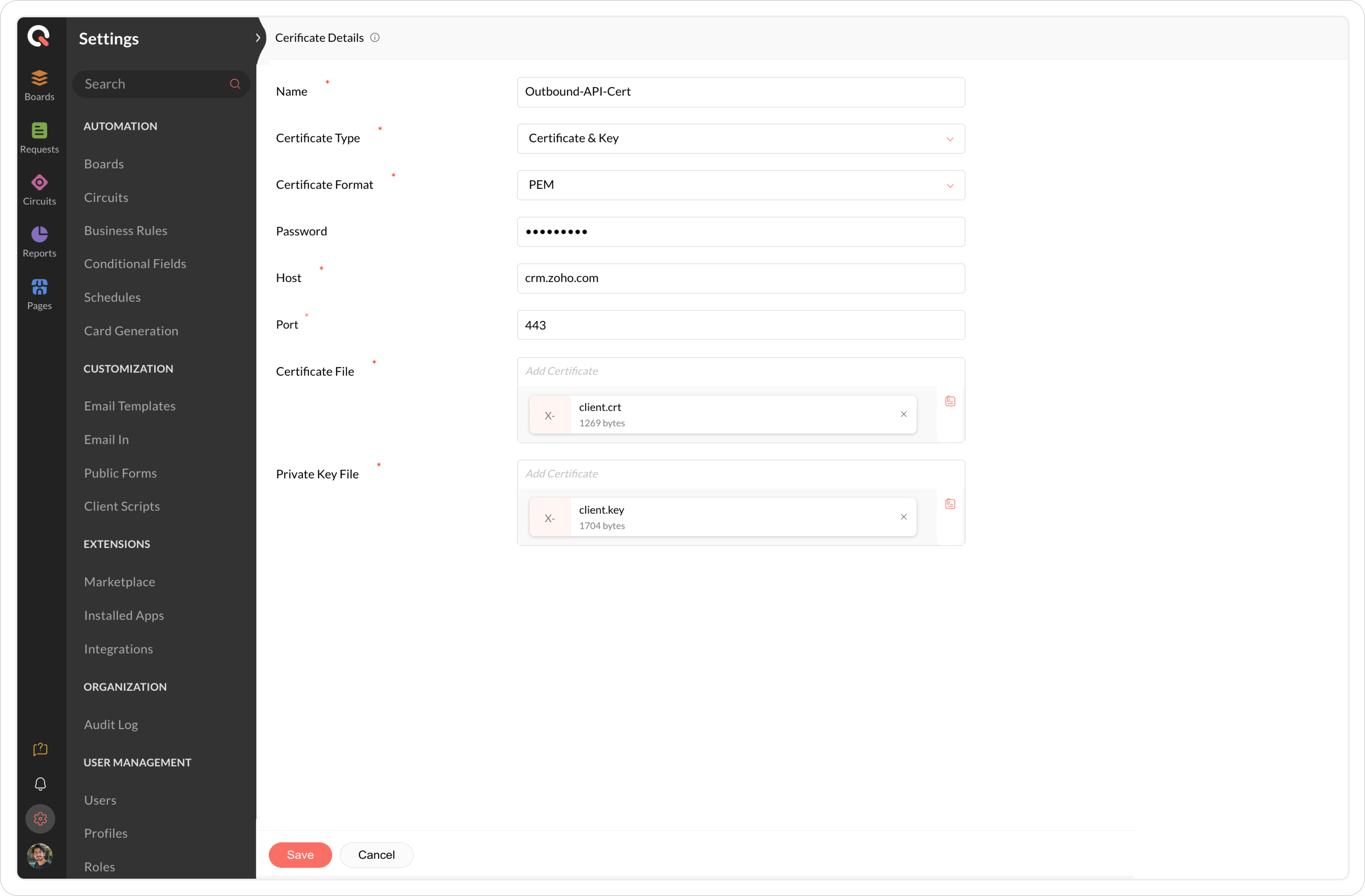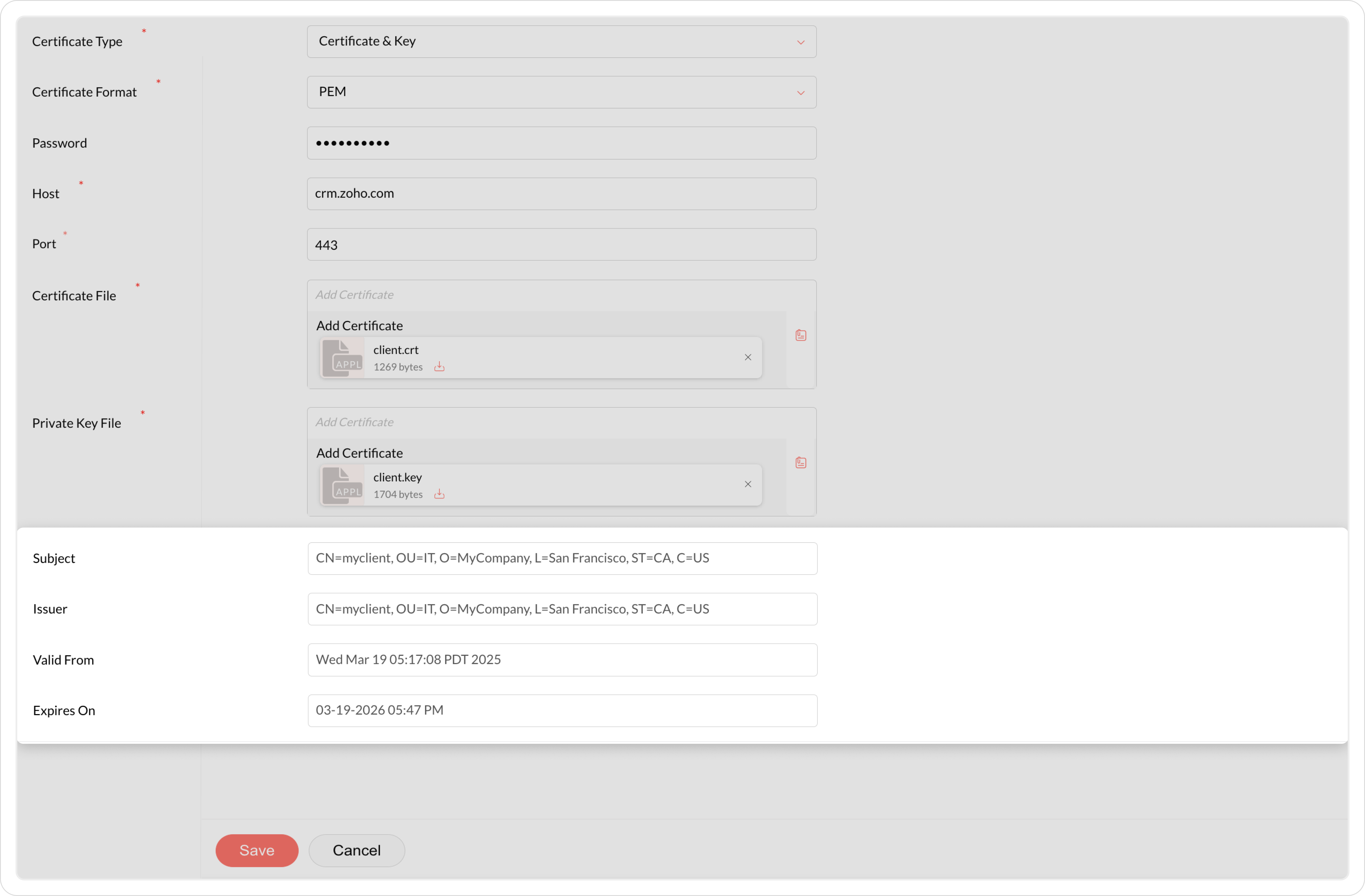 Once saved, Qntrl auto-generates and displays the following certificate details: