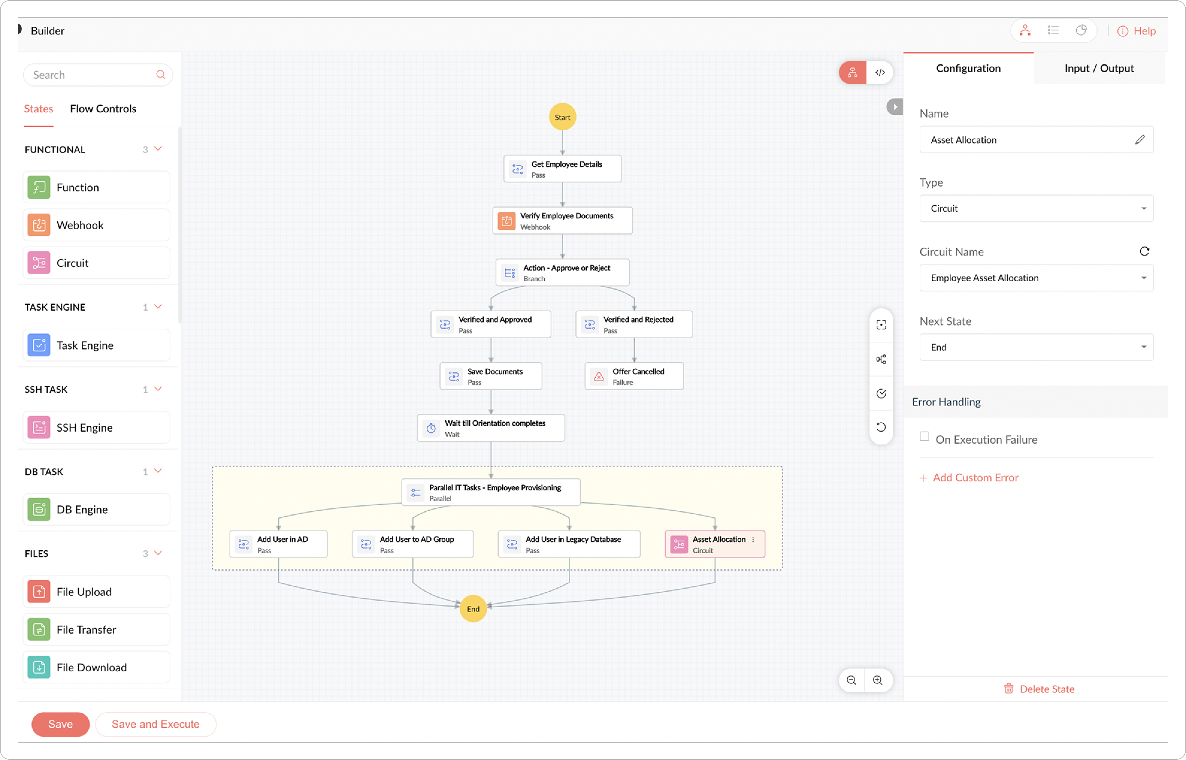 One case is to create a distinct circuit for the asset allocation process. This Circuit can be nested within the circuit designed for New Employee Onboarding in one of the Parallel states. By utilizing the Circuit state, this Asset Allocation circuit can be invoked to facilitate employee provisioning.