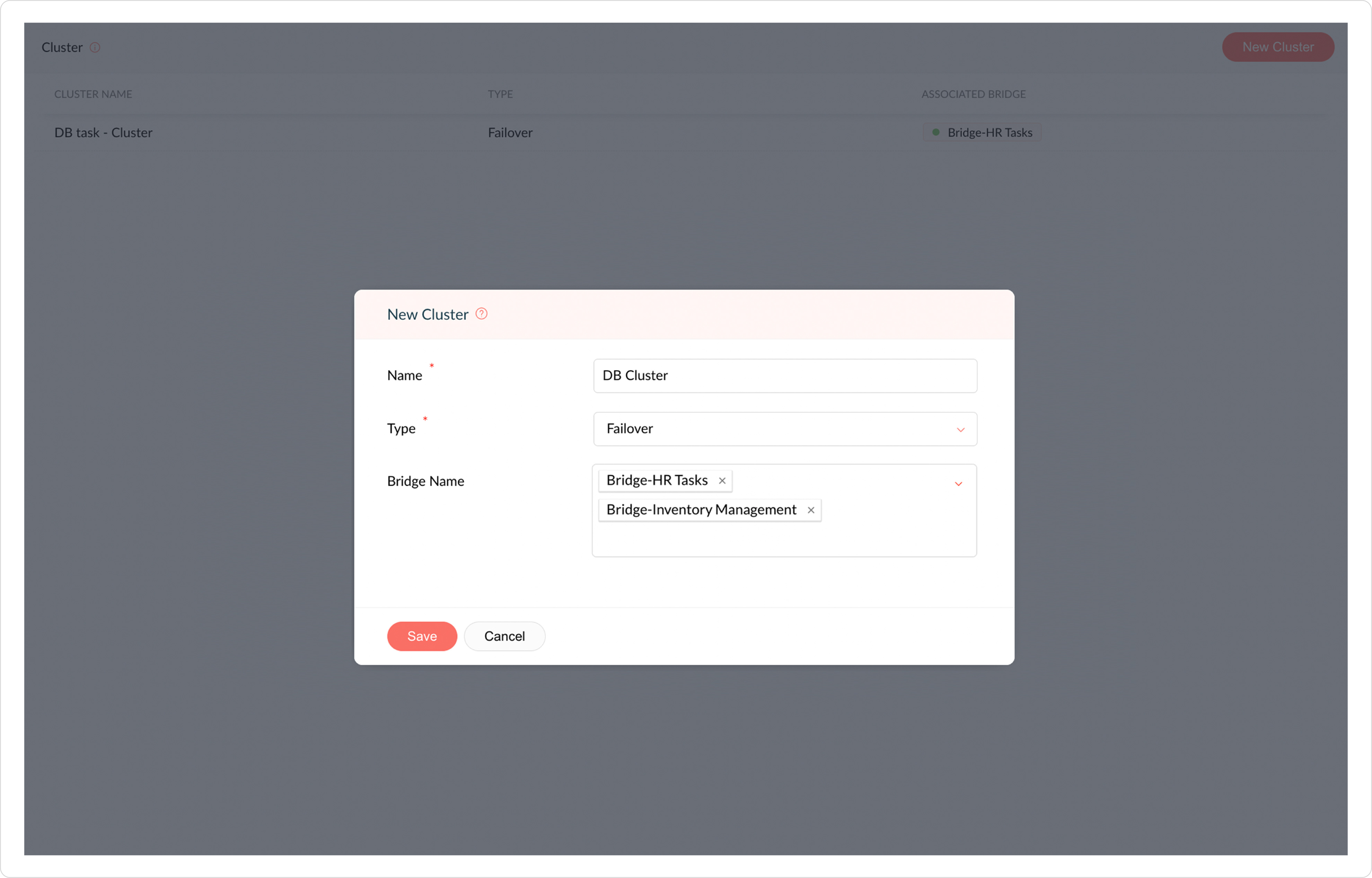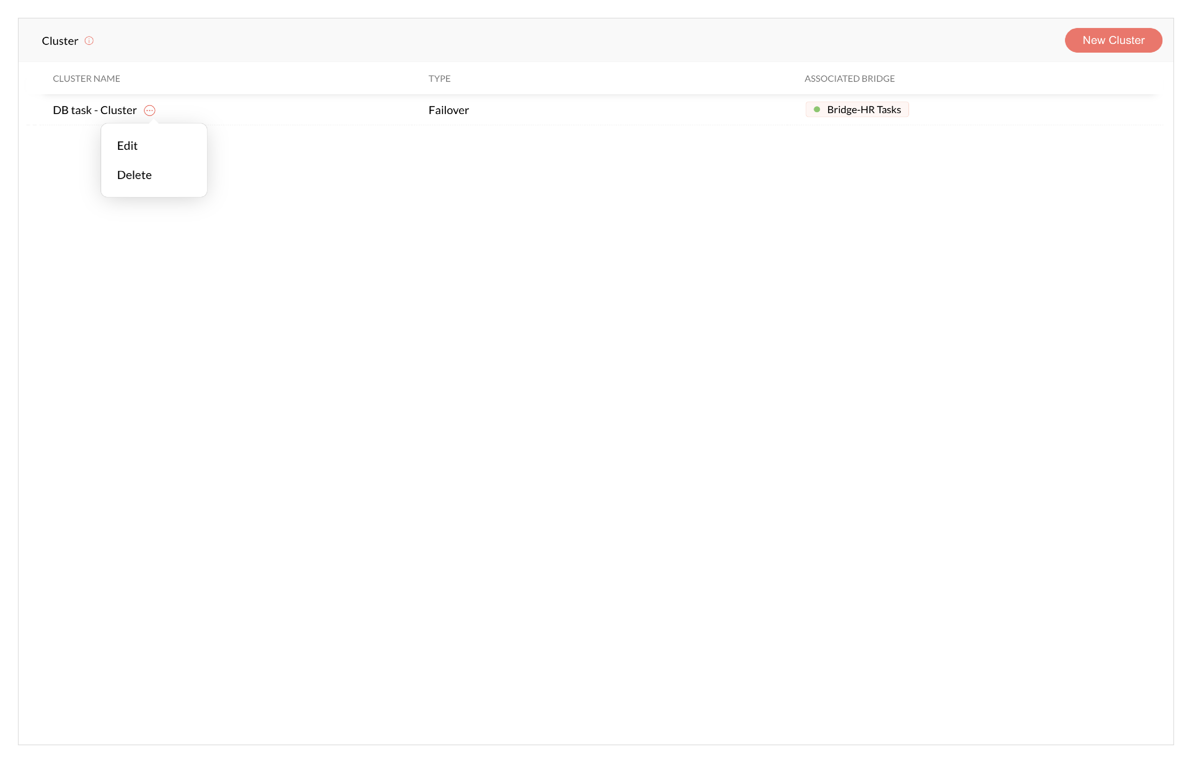 - The Cluster operates only before a task is executed. If the bridge encounters issues after the task is assigned, the cluster concept does not apply.