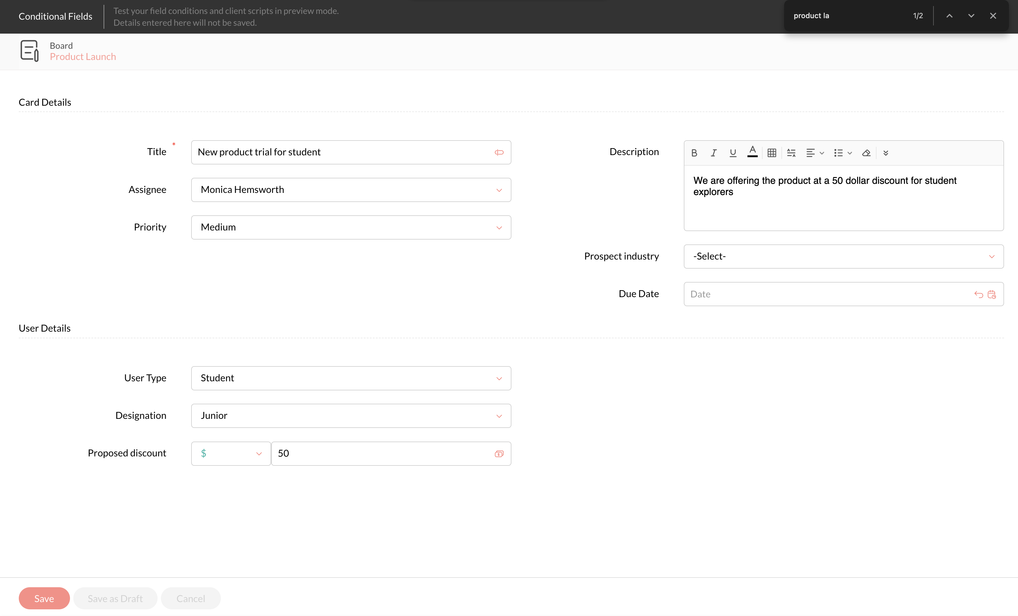 In specific business scenarios, we would want certain fields or sections of the form to be displayed based on the input a user enters in another field. For example, when a student requests your product for trial, you’d want to suggest them a discount. But, when a business owner requests a trial, you’d be more interested in knowing his business details and how potential his client base can be for you. To implement such scenarios in the form and gain relevant details, you can use conditional fields in Qntrl.