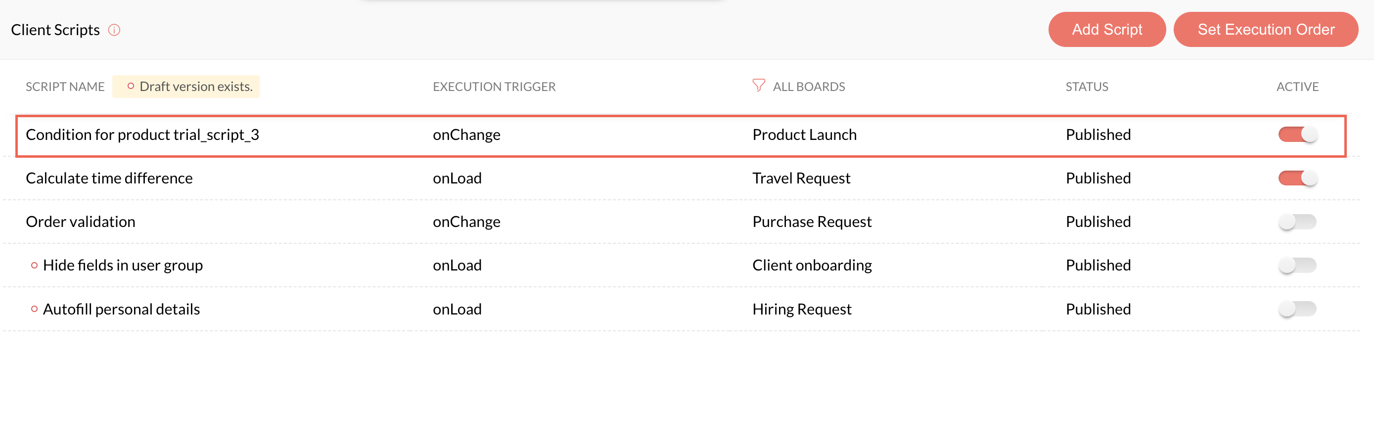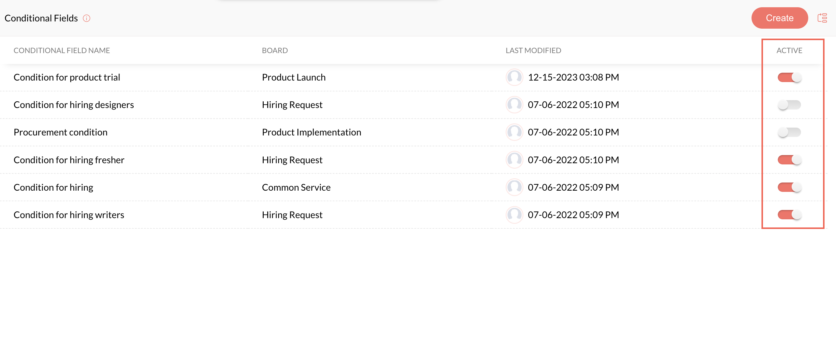 - Toggle the button under the Active column to activate or deactivate the corresponding conditional field.