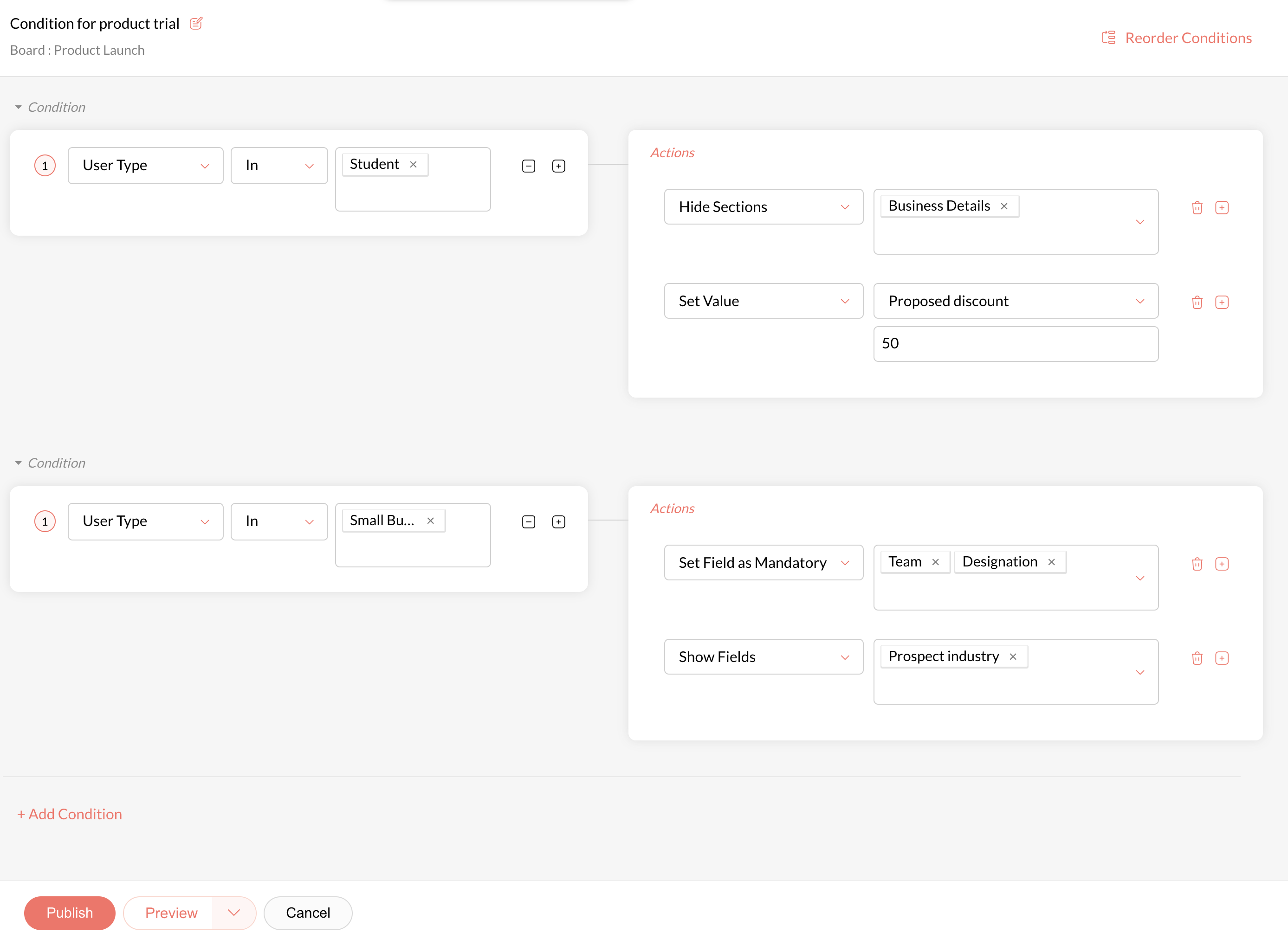 Once the conditions and actions are set, click Preview to test the field conditions before you publish it. If you had selected multiple execution locations, you will have an option to preview in all the selected locations.