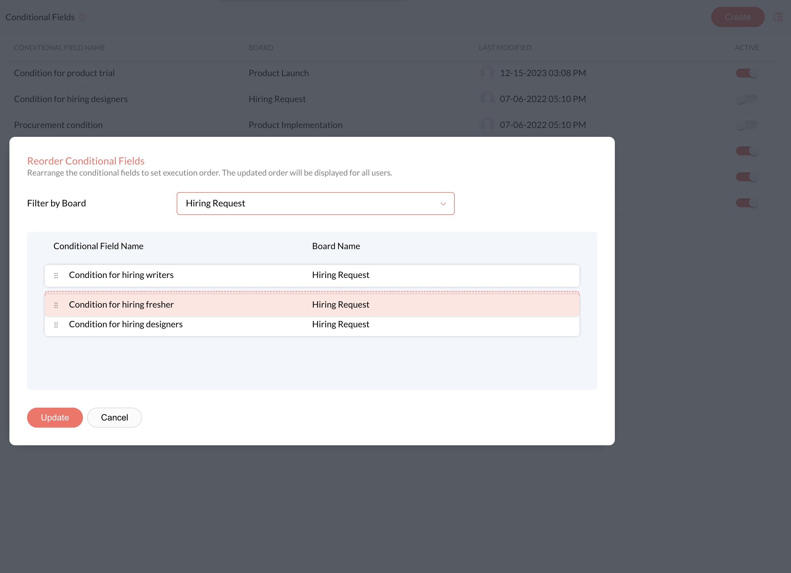 - Select a board in the Filter by Board field to reorder conditional fields in the selected board.