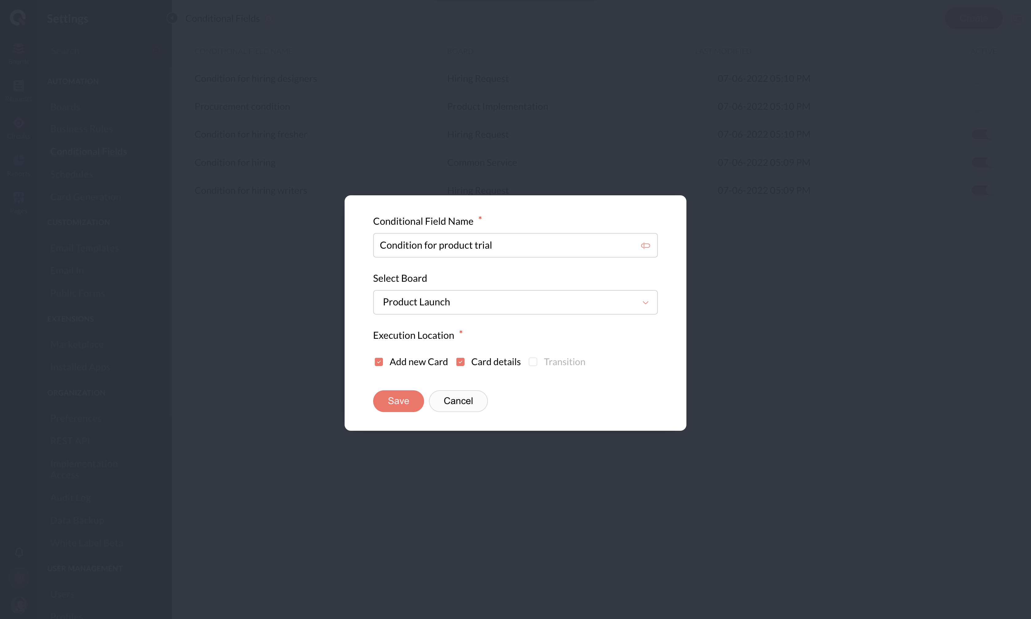 - Execution Location: Choose a location where the conditional field should be executed. Note that on selecting Transition , the other two options-- Add new card and Card details --are disabled, and vice-versa.