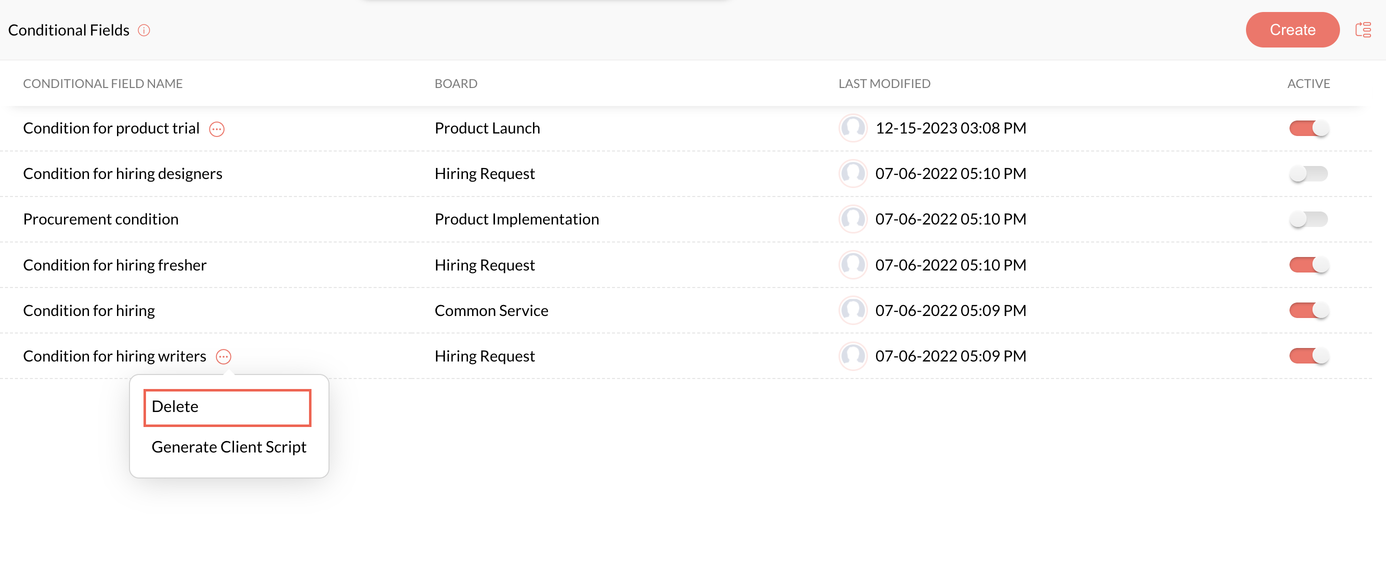 On deleting a conditional field, all the configured conditions and actions in that field will also be deleted and cannot be recovered.