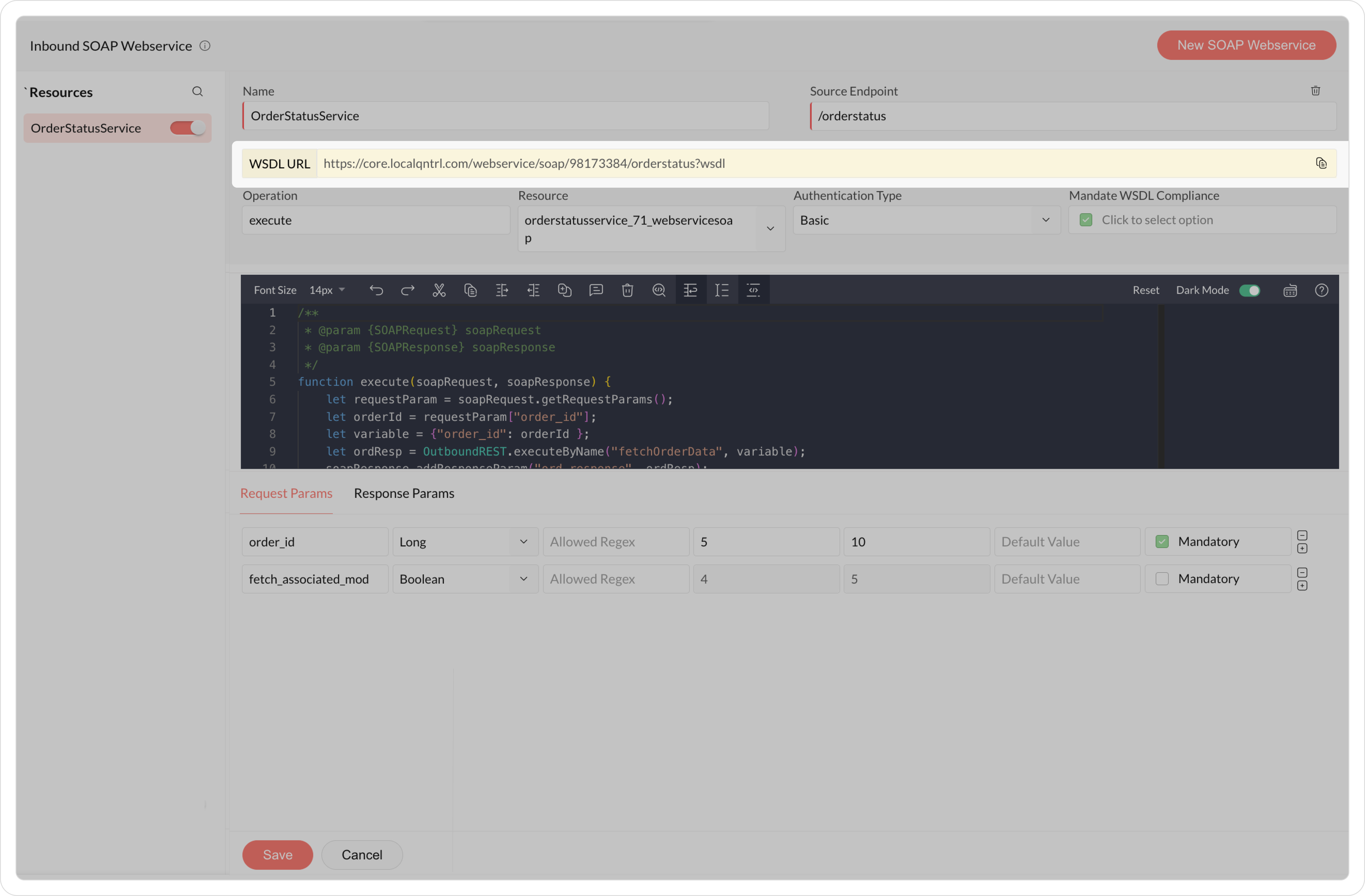 Qntrl automatically generates the WSDL based on the endpoint URL, operation name, and the configured request/response parameters. Any changes made to these configurations will automatically update the WSDL.