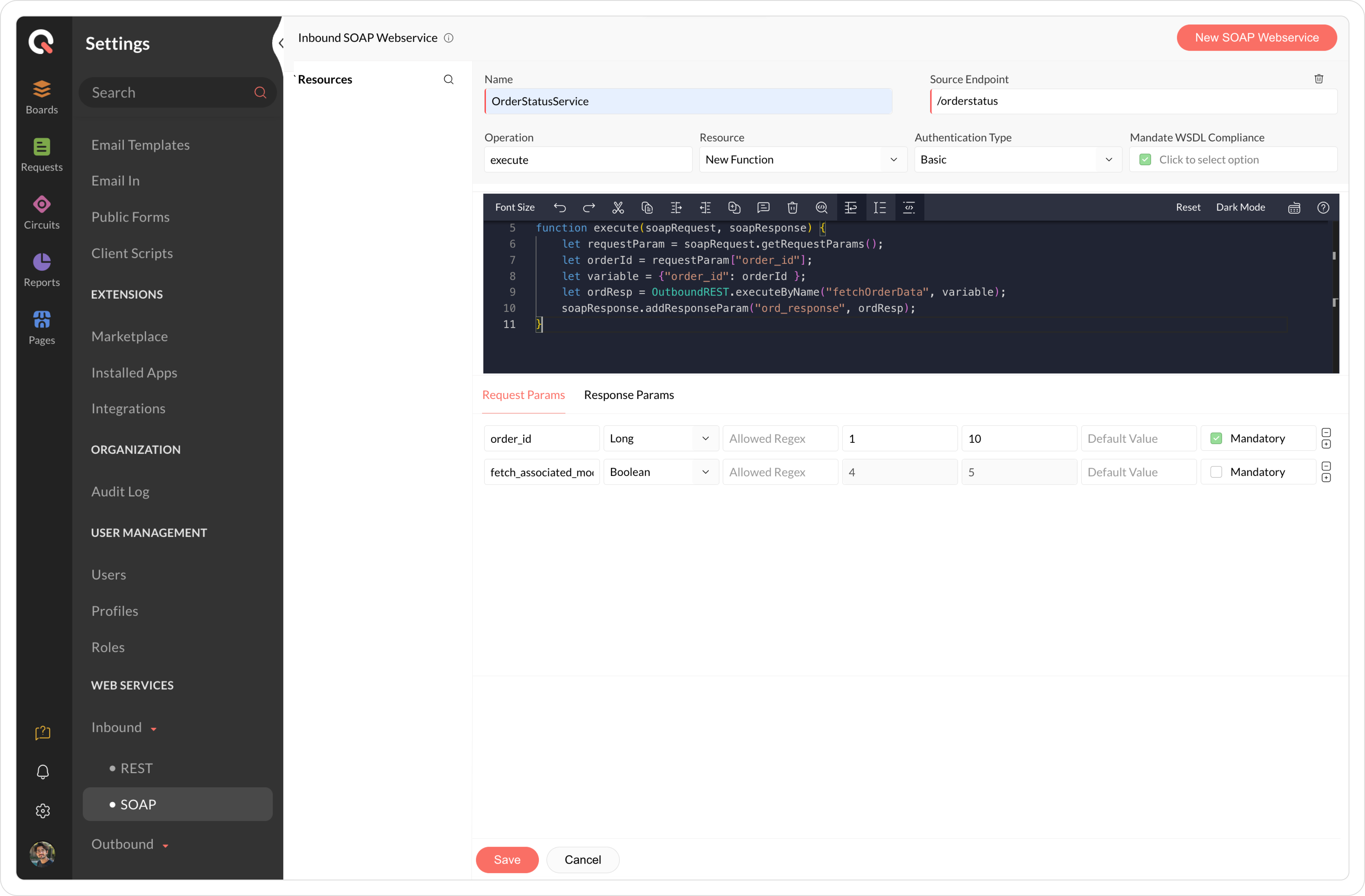 Inbound SOAP Web Services allow you to create endpoints that external systems can call to interact with your Qntrl instance. When a SOAP request is sent from an external system, Qntrl processes the request and sends back a response based on predefined operations. To define and structure these SOAP-based interactions, WSDL (Web Services Description Language) contracts are used which describes the available operations, the expected request parameters, and the format of the response.
