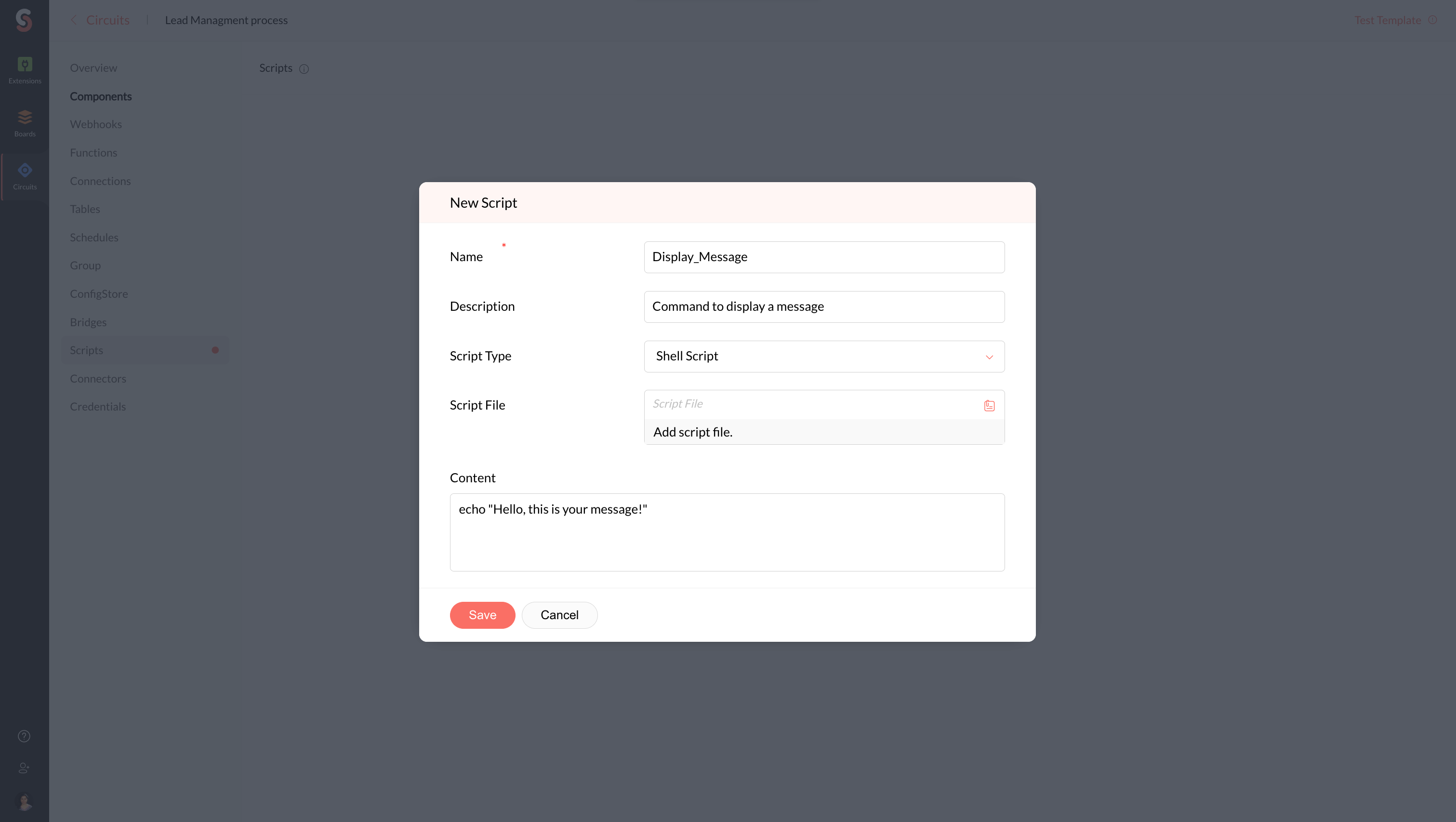 Navigate to the Scripts section in the left panel of your circuit template and and click New Script.