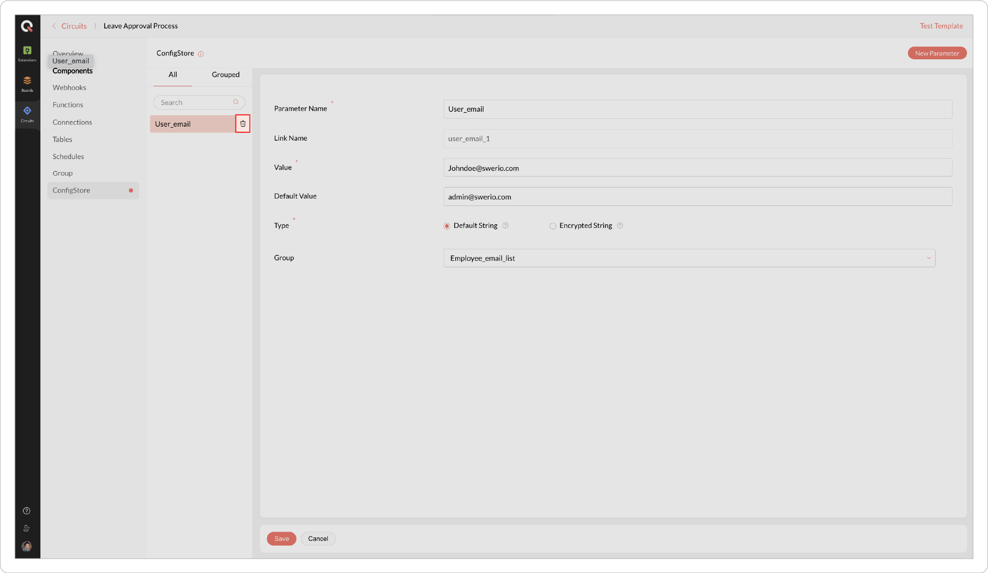 Use the format ${parameter's_link_name} to associate the created parameter within Circuit.