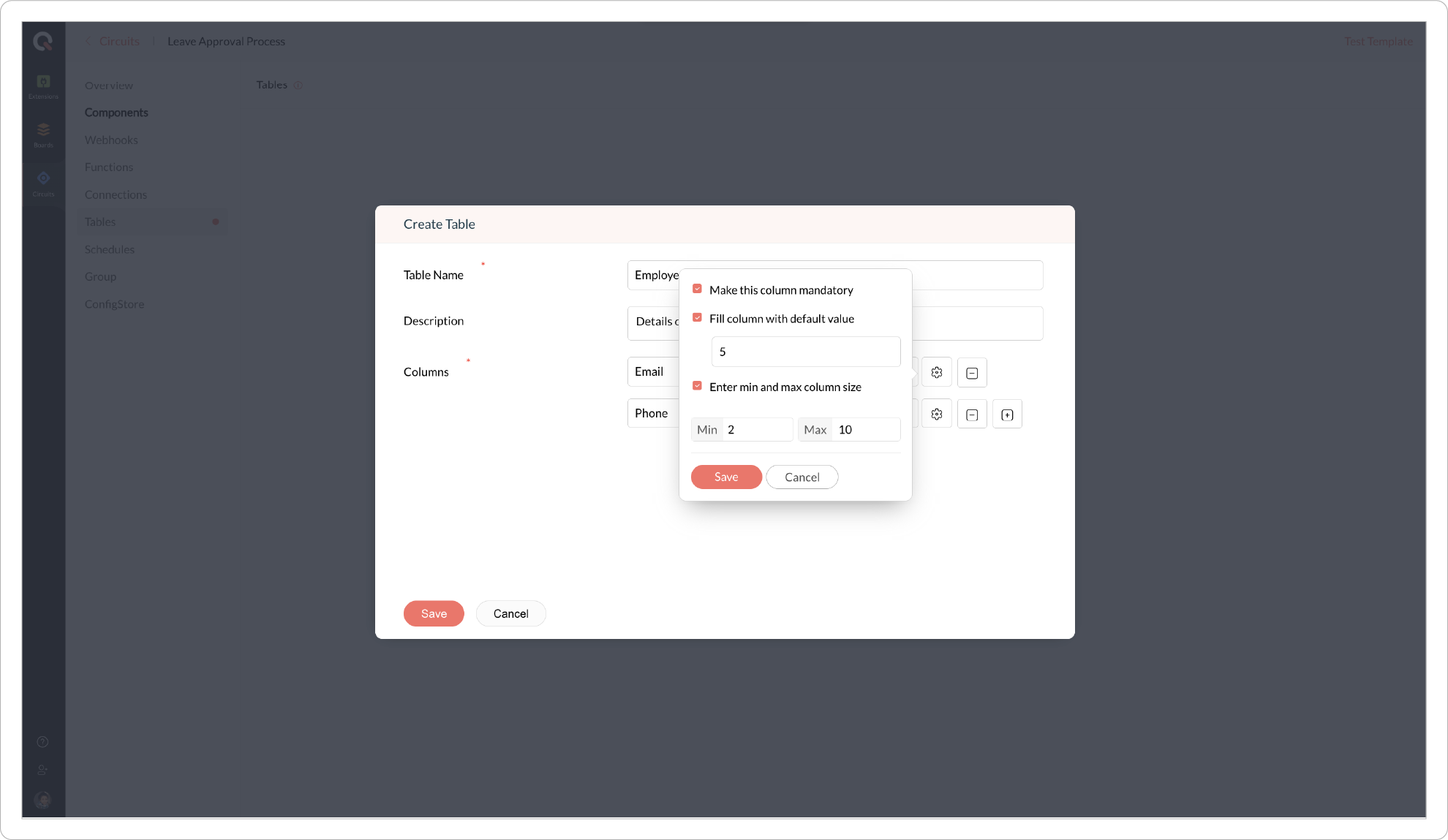 Column Settings: Click the settings icon and configure column settings (mandatory, default value, minimum/maximum values).
