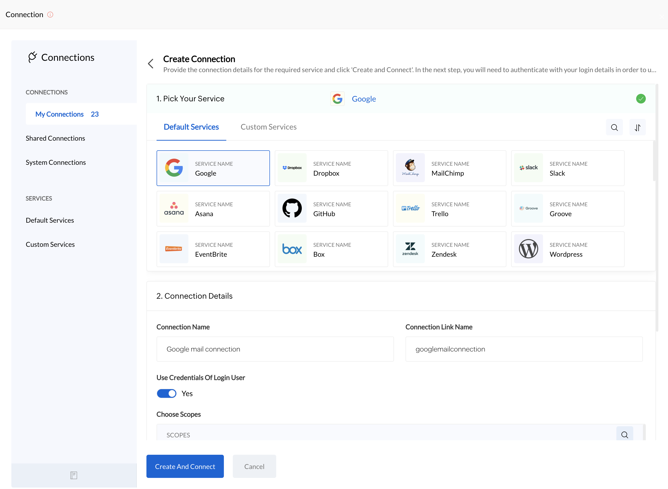 Users can either connect with an available service or create their own connection with a custom service.