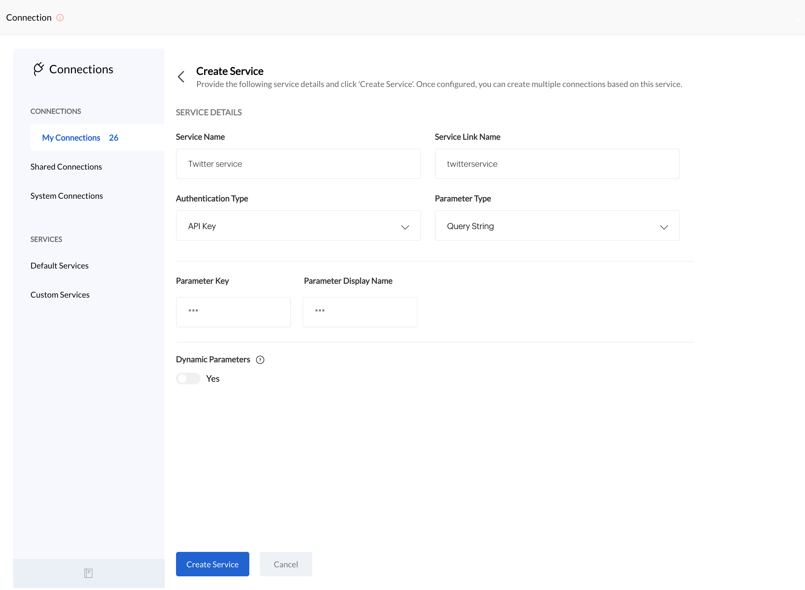 Enter the parameter or authentication details of the service to connect to it.