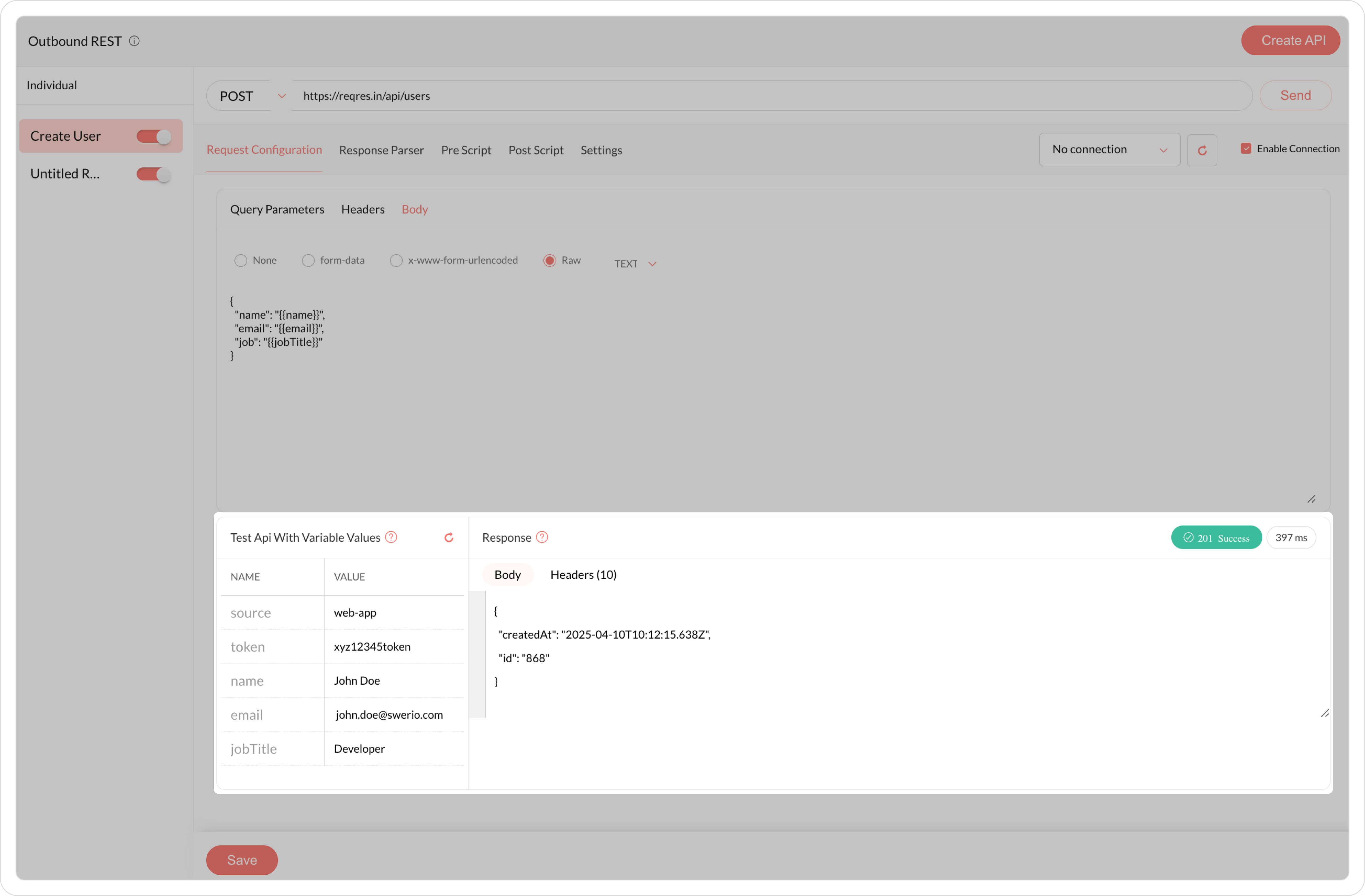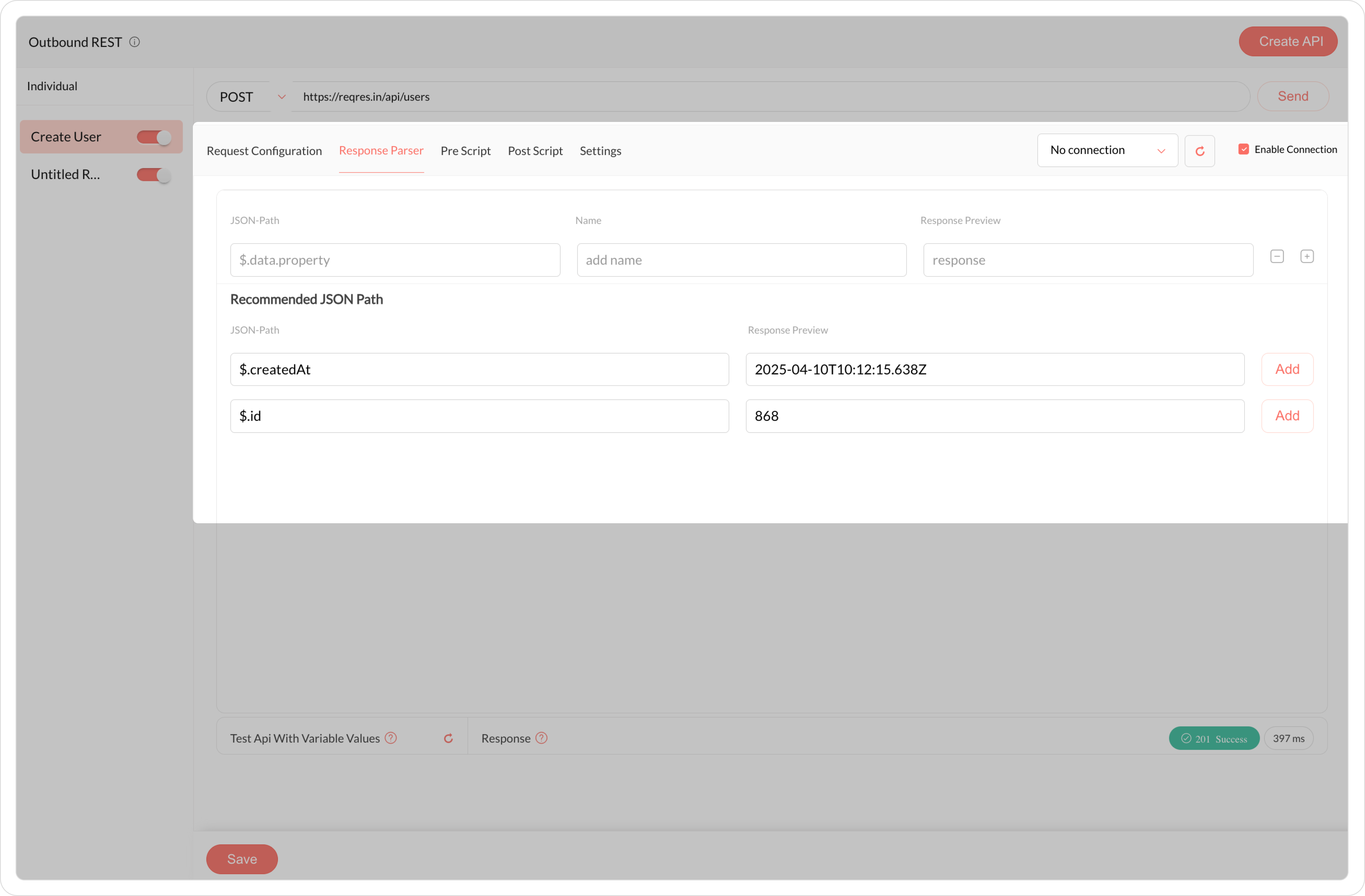 After execution, use the Response Parser to extract specific data from the JSON response.