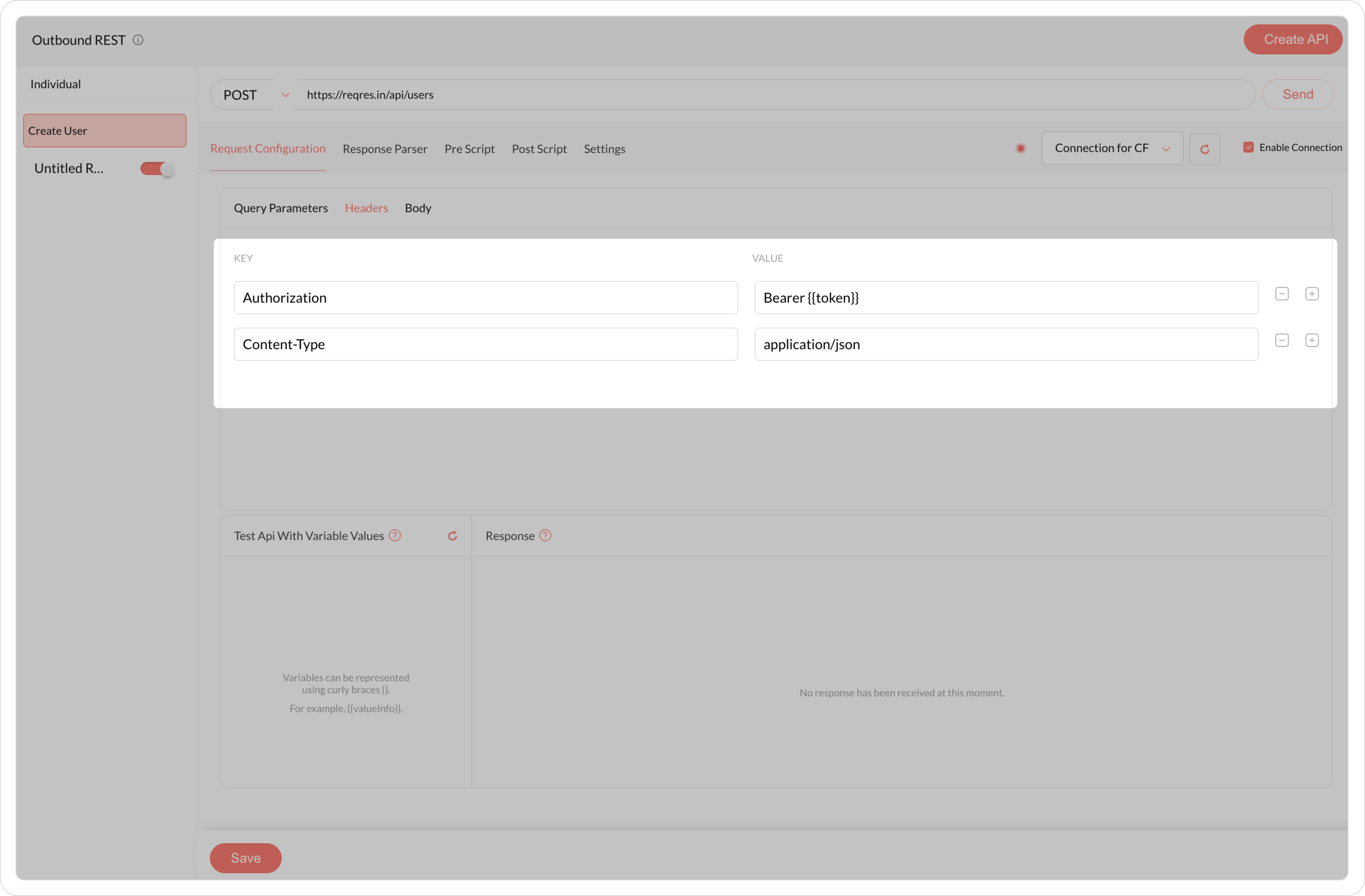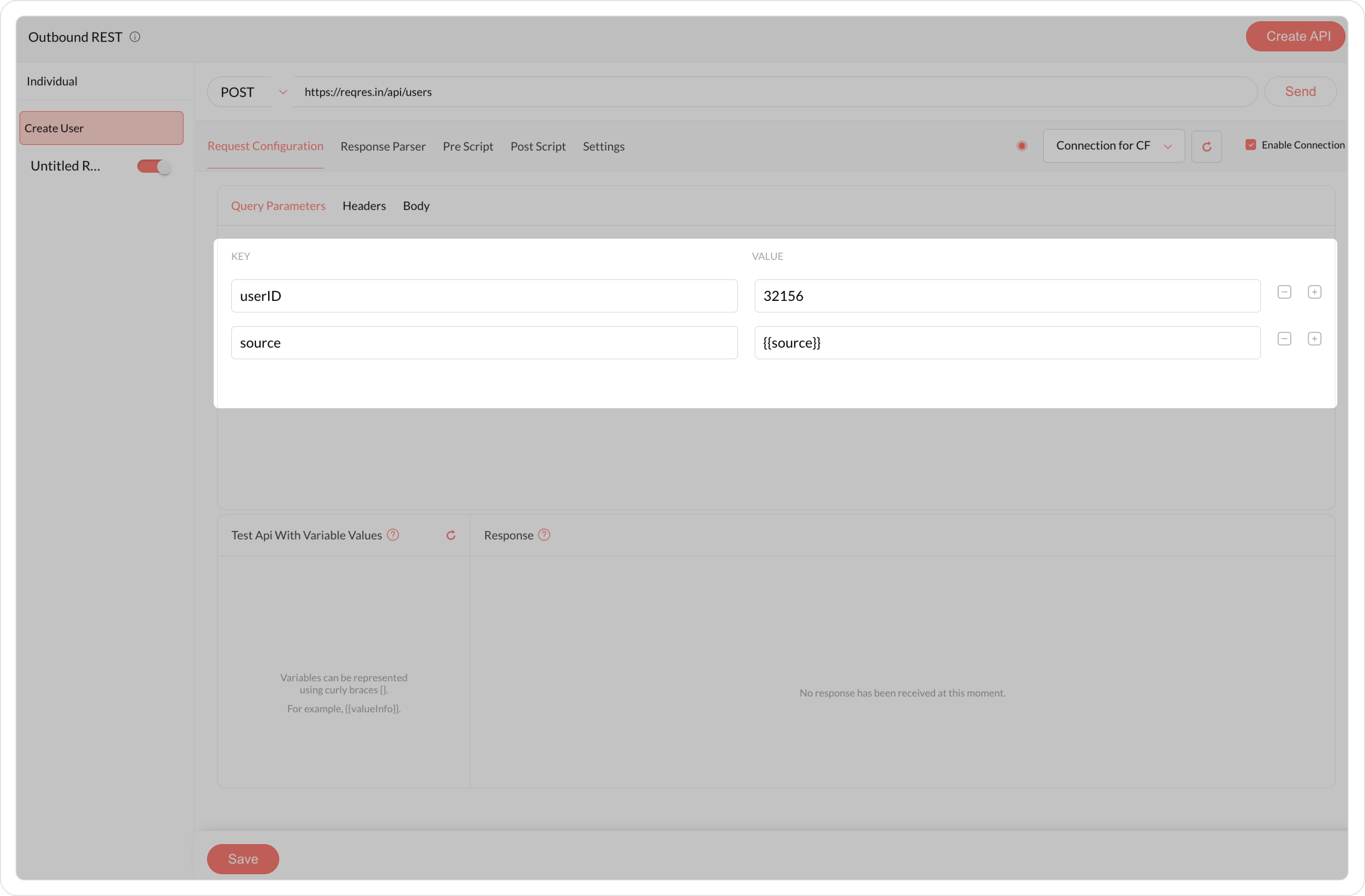 You can insert variables anywhere in the request configuration using the {{variableName}} syntax.