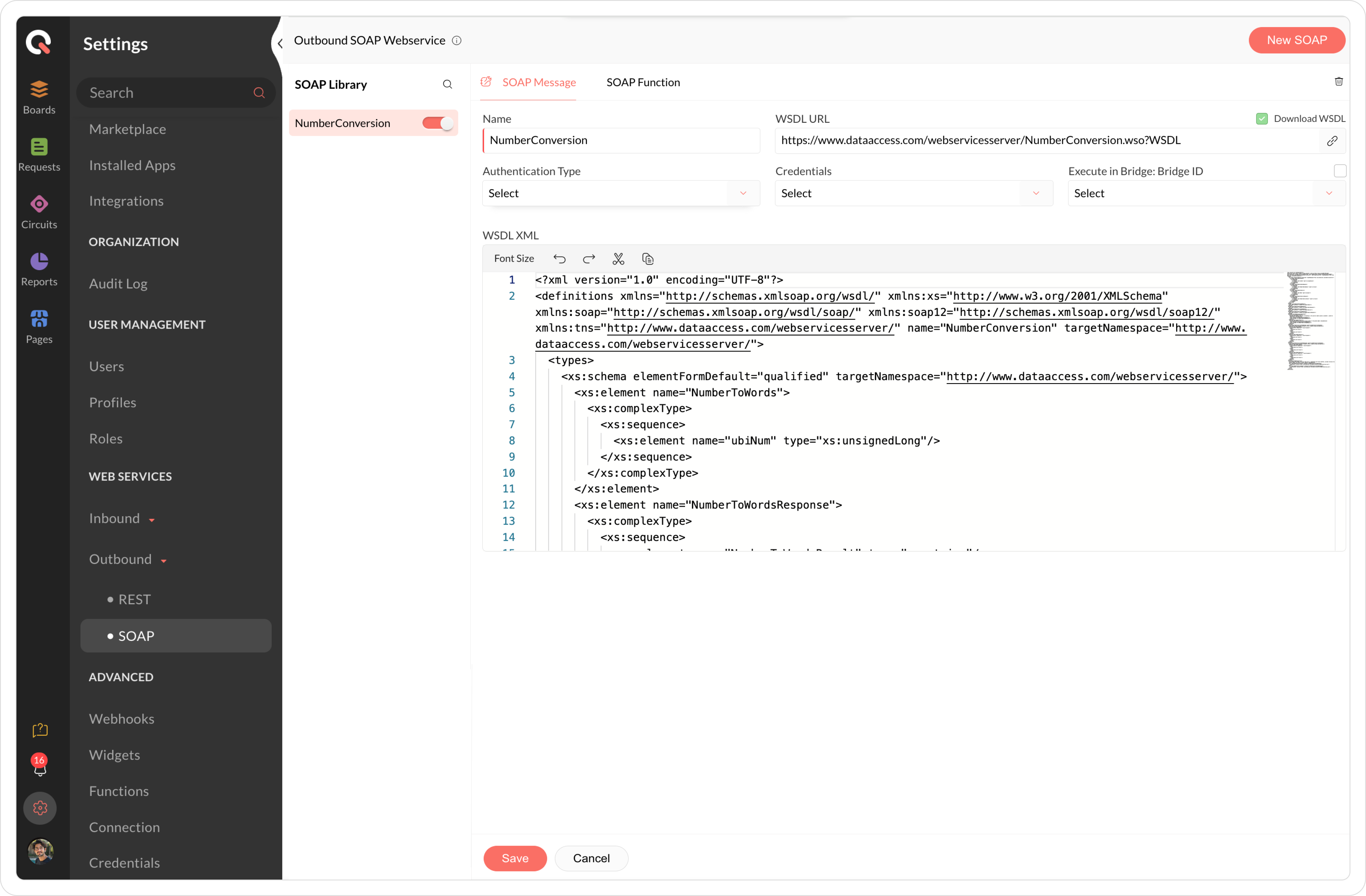 Navigate to (settings) >> WEB SERVICES >> Outbound >> Select SOAP.