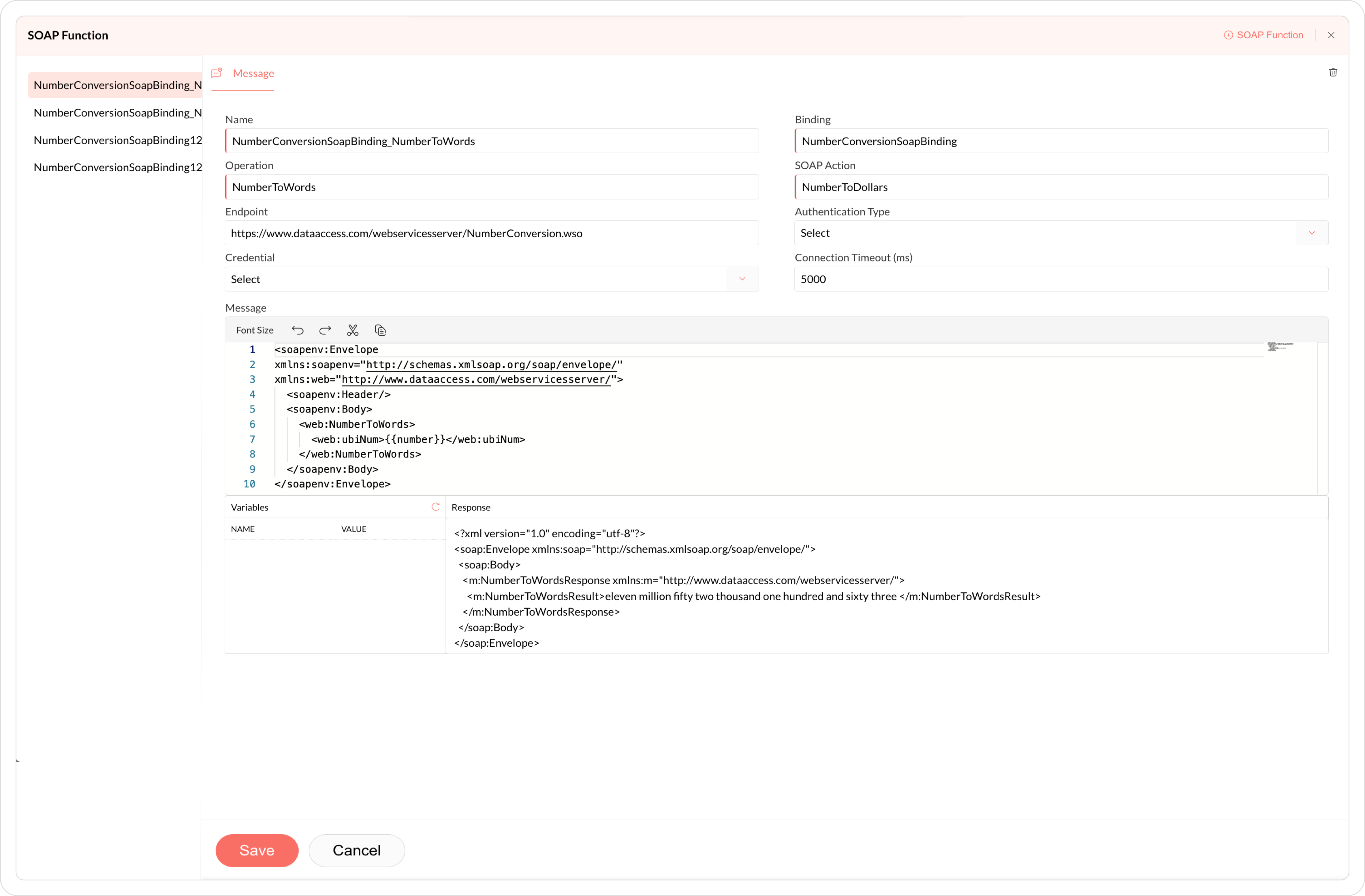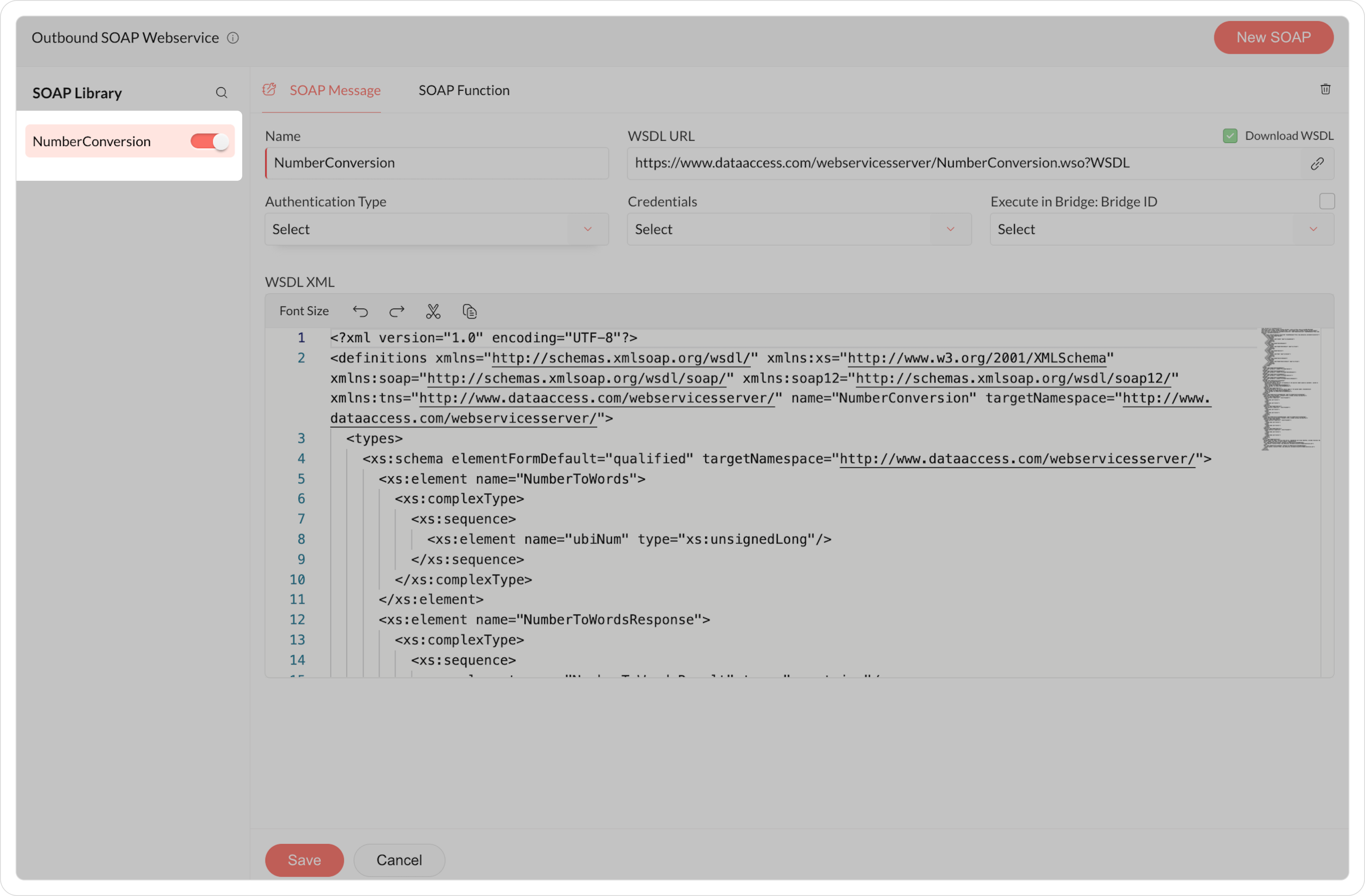 Credential: Select the credential for authentication. The first credential provided during SOAP outbound creation is auto-selected but can be overwritten.