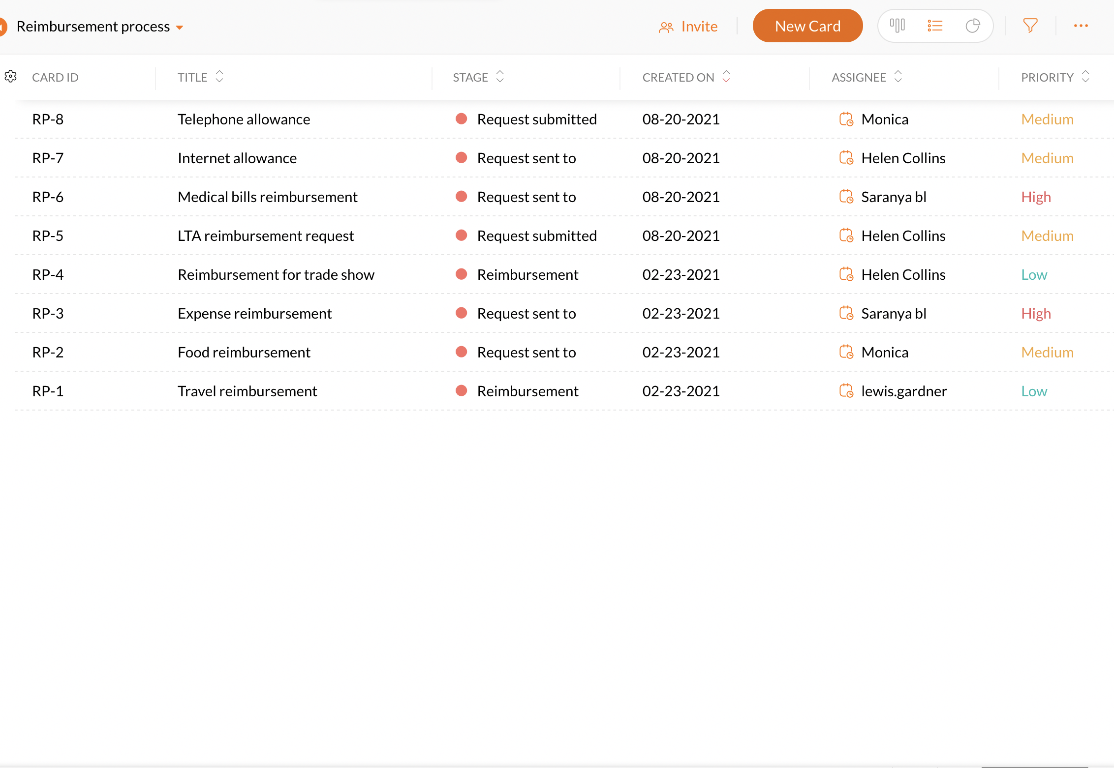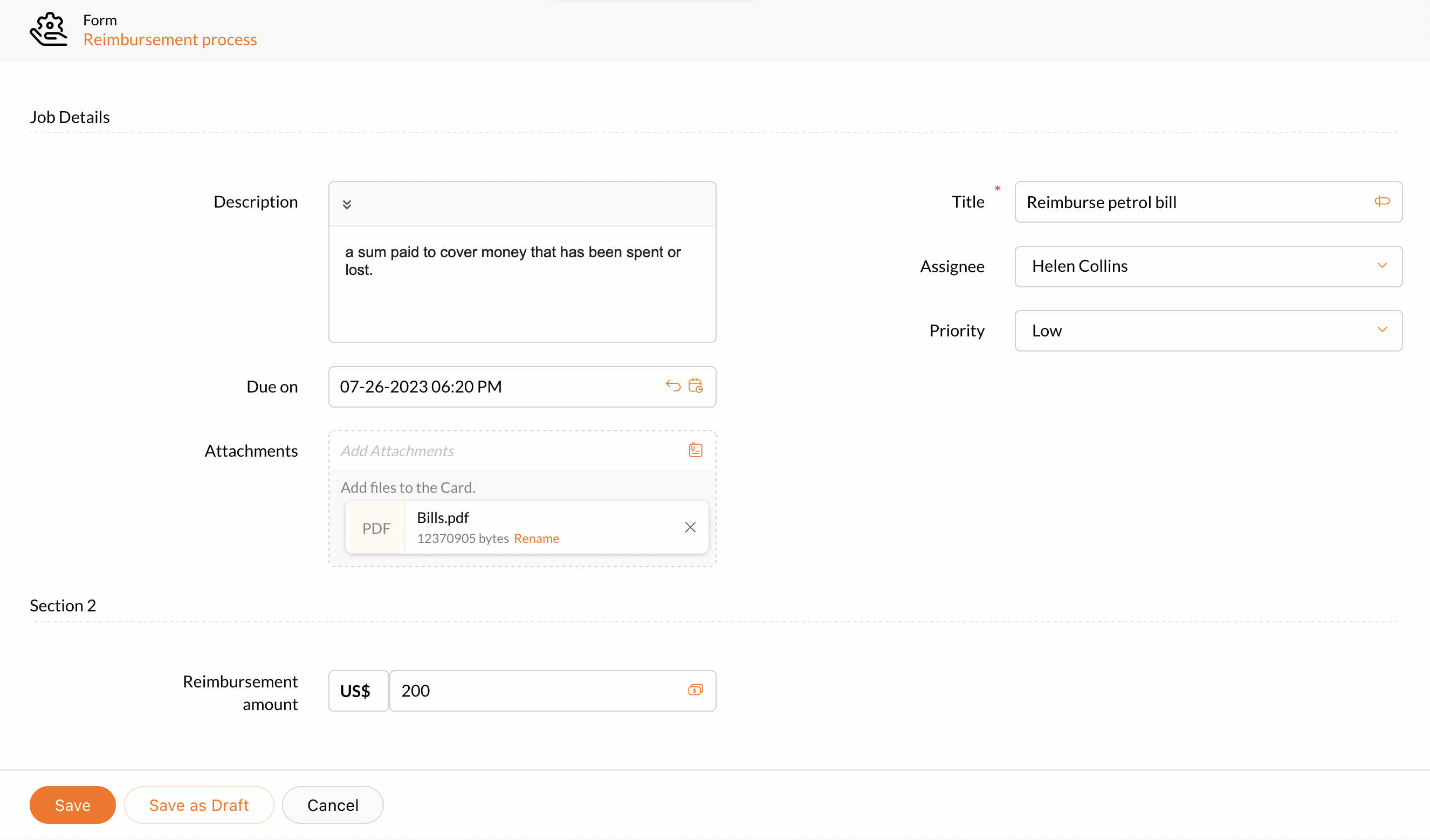Other custom fields designed in the form can only be edited if you have both the view/ edit permission on the respective fields. This permission can be restricted for all users. Admins and managers will have the view/edit permission for the custom fields for all cards. Members, participants, and requesters will only have view/edit permission for their own cards.
