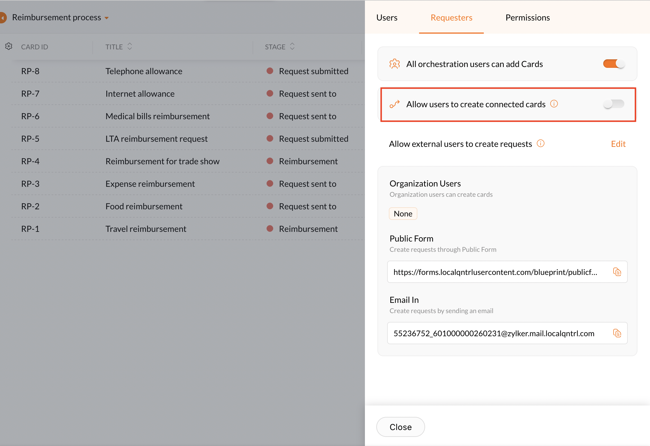 - Allow users to create connected cards will be disabled by default. Enable this option to allow users to create connected cards.