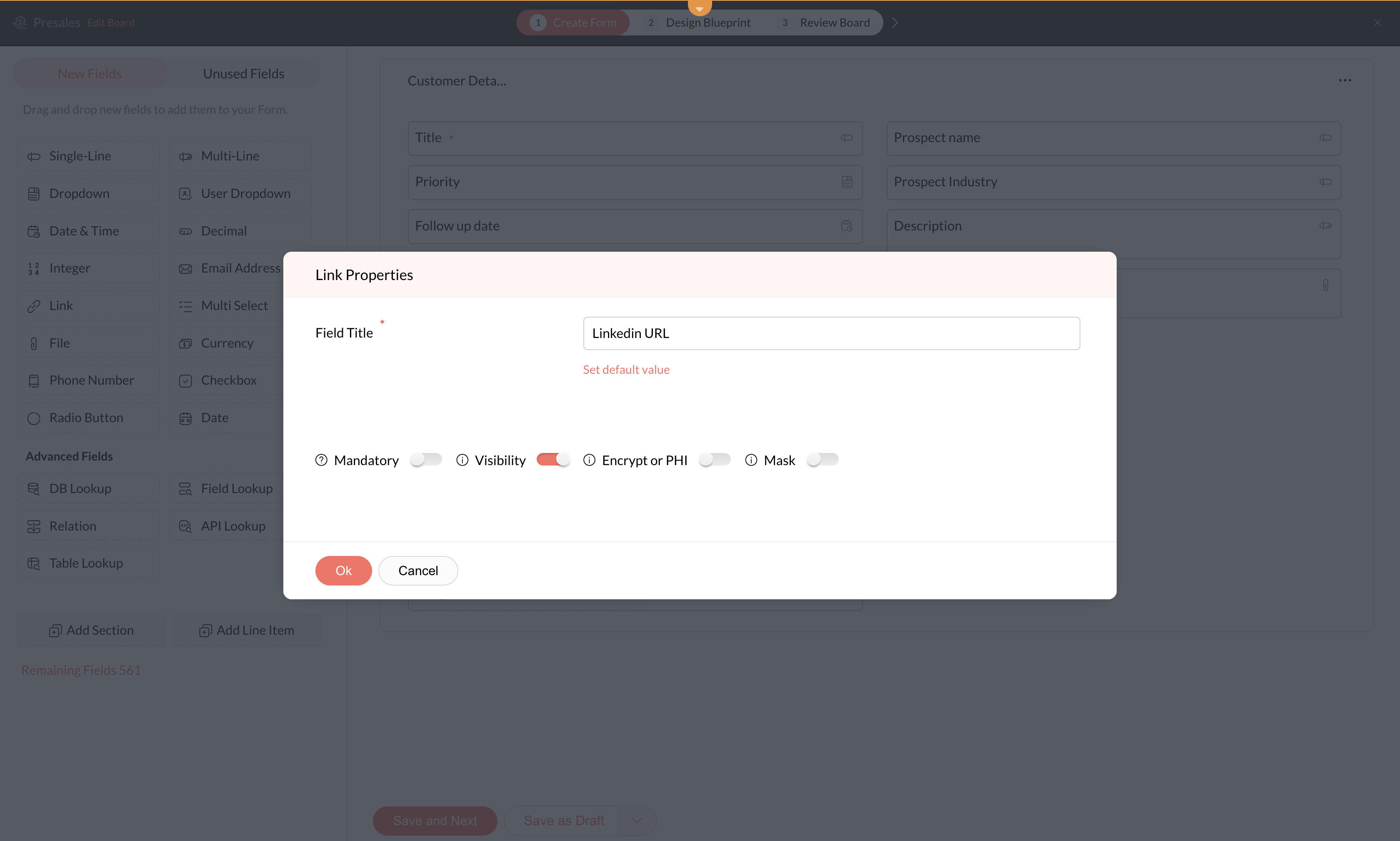 - To set a default value for your field, click on the Set default value option and enter a valid link.