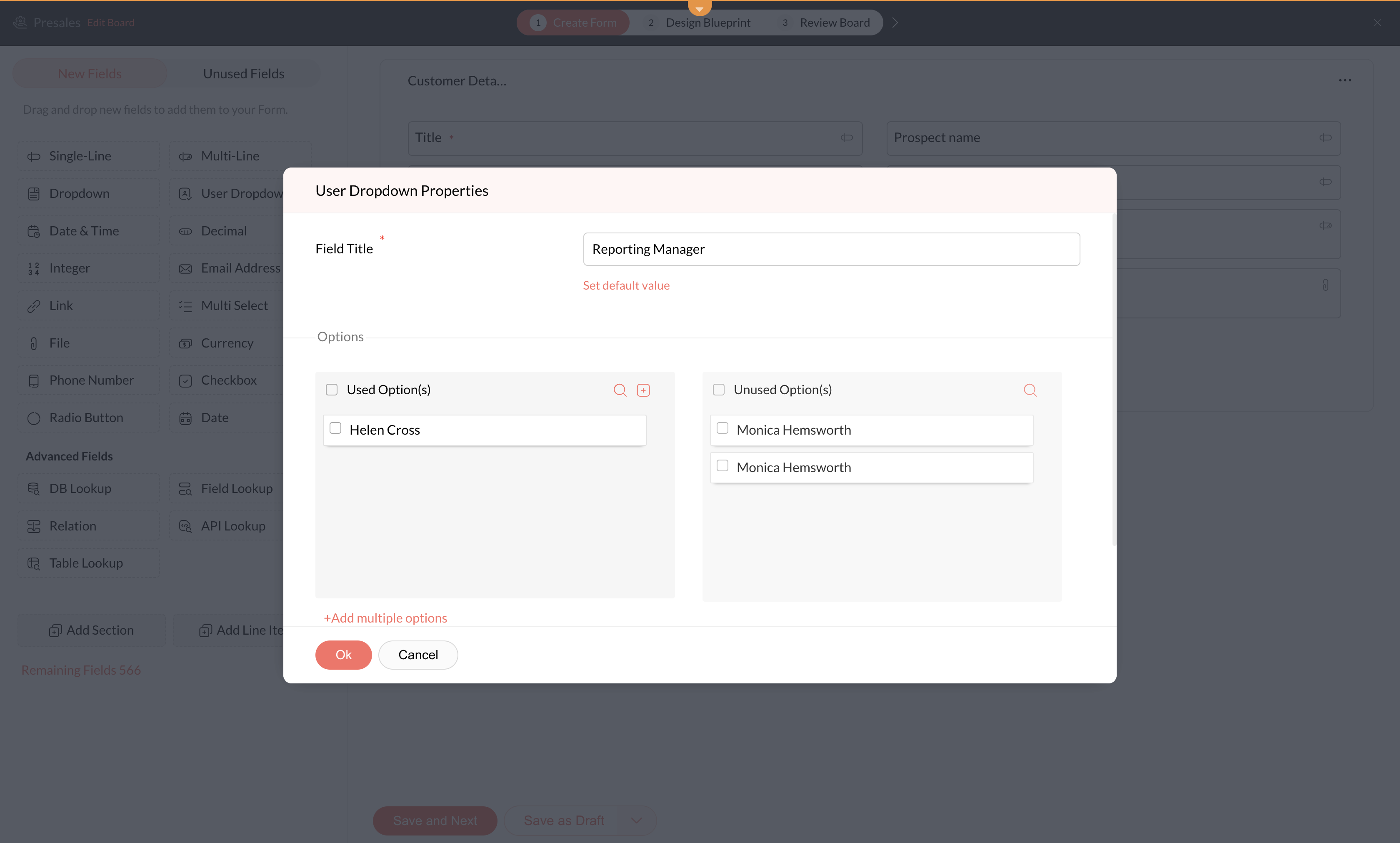 - Drag and drop the User dropdown field from the New Fields tray onto the right panel.