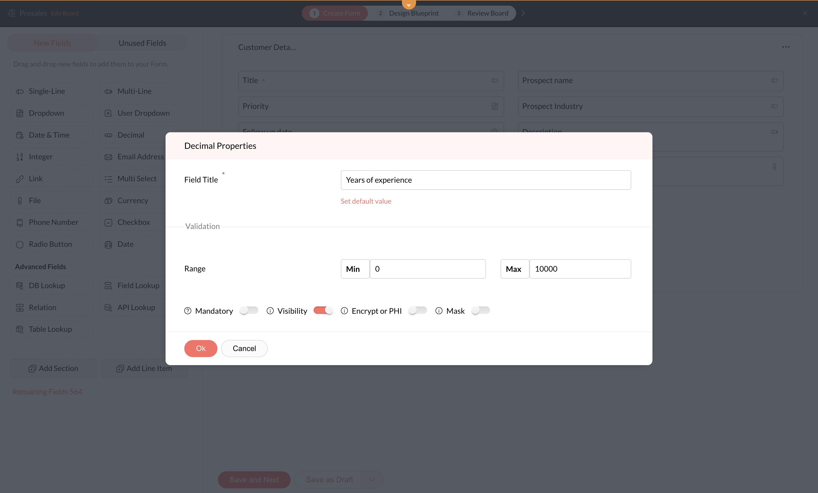- Range : Enter the minimum and maximum limit for decimal value that the user can enter.