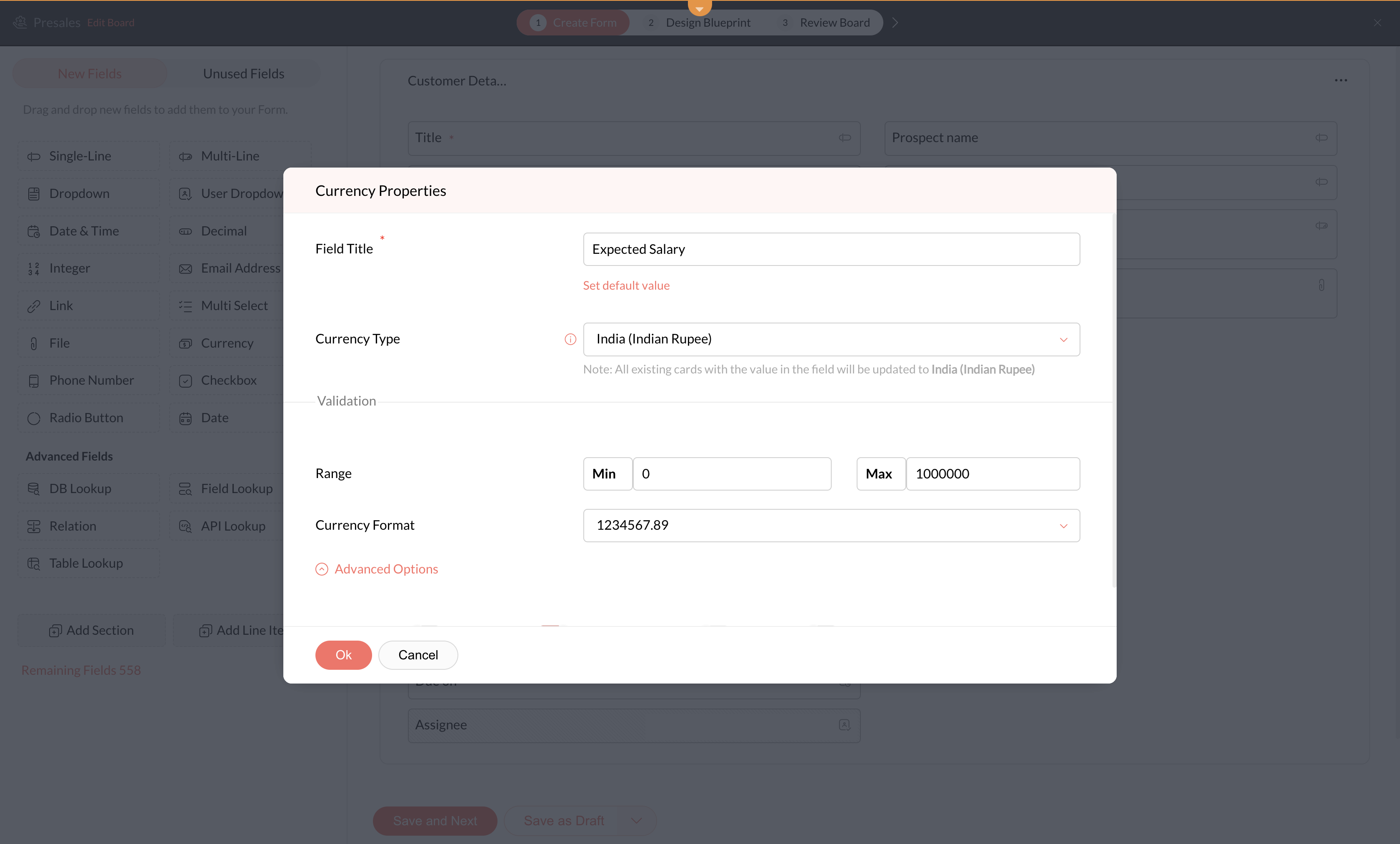 - Drag and drop the Currency field from the New Fields tray onto the right panel.
