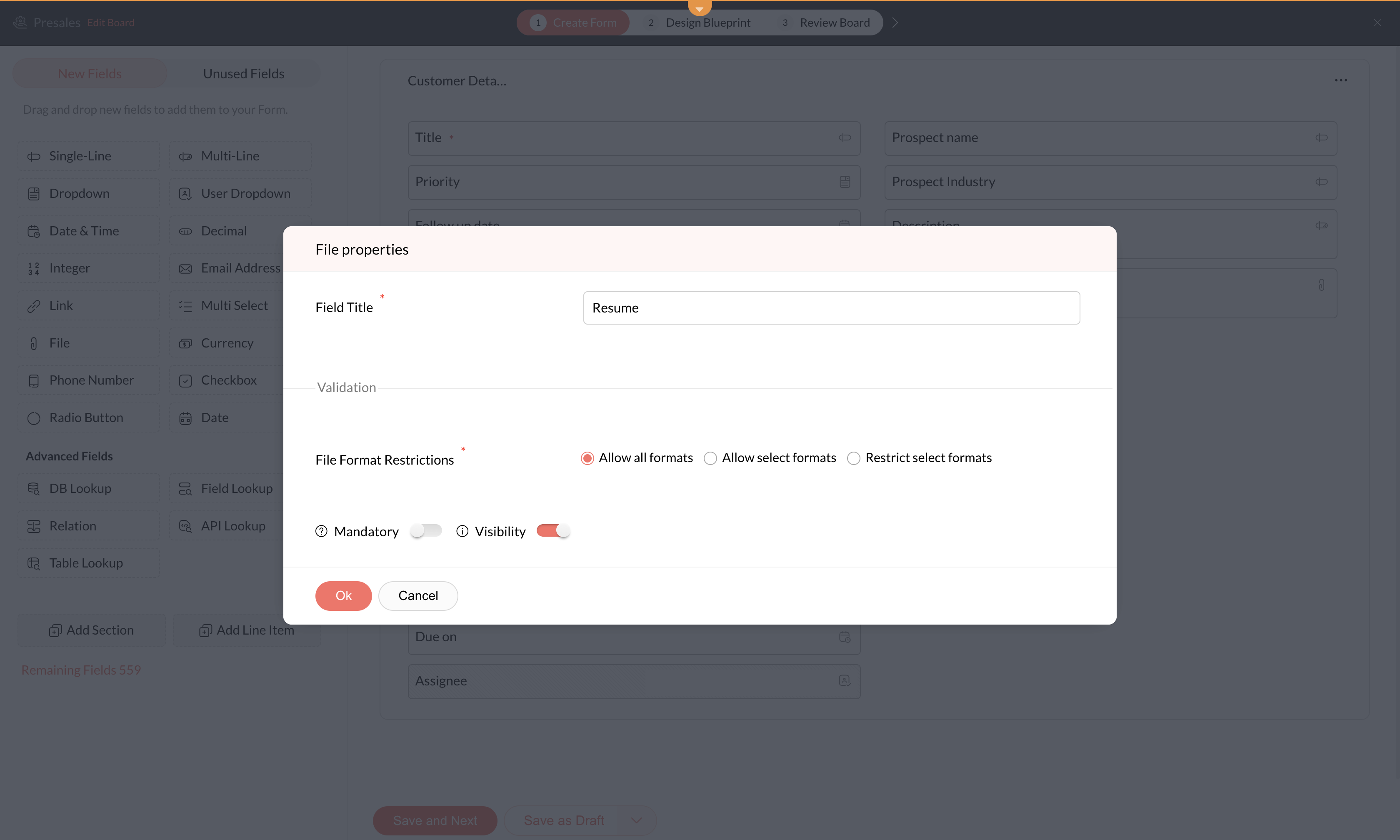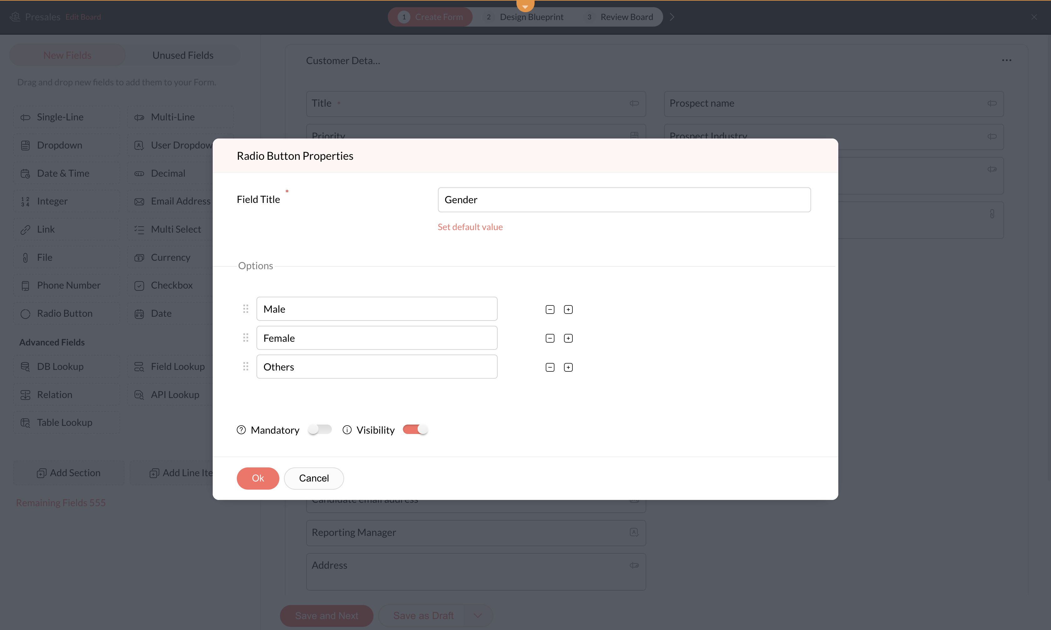 - Visibility : Toggle the button YES to make the field visible while creating cards.