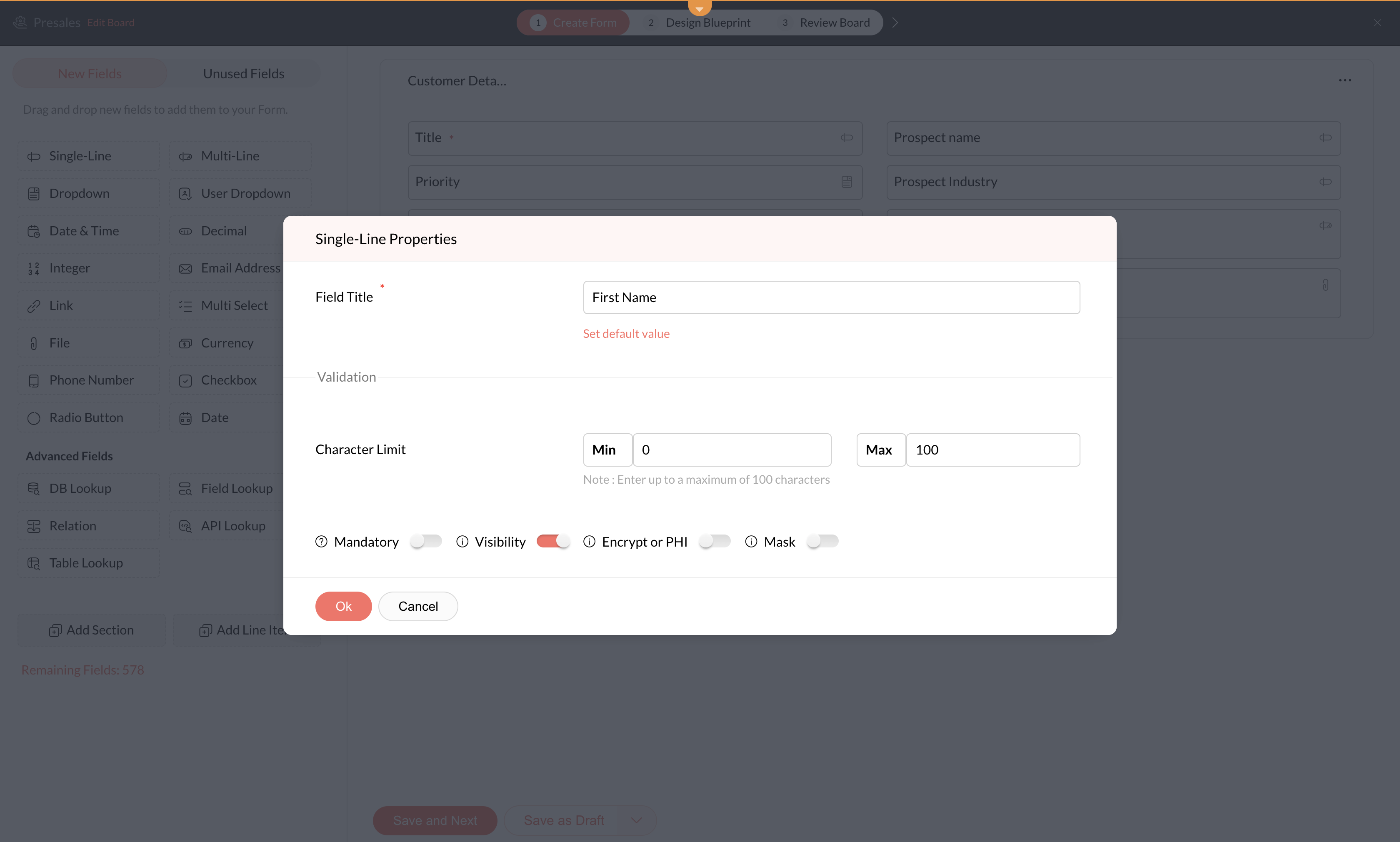 - Drag and drop the Single-Line field from the New Fields tray onto the right panel.