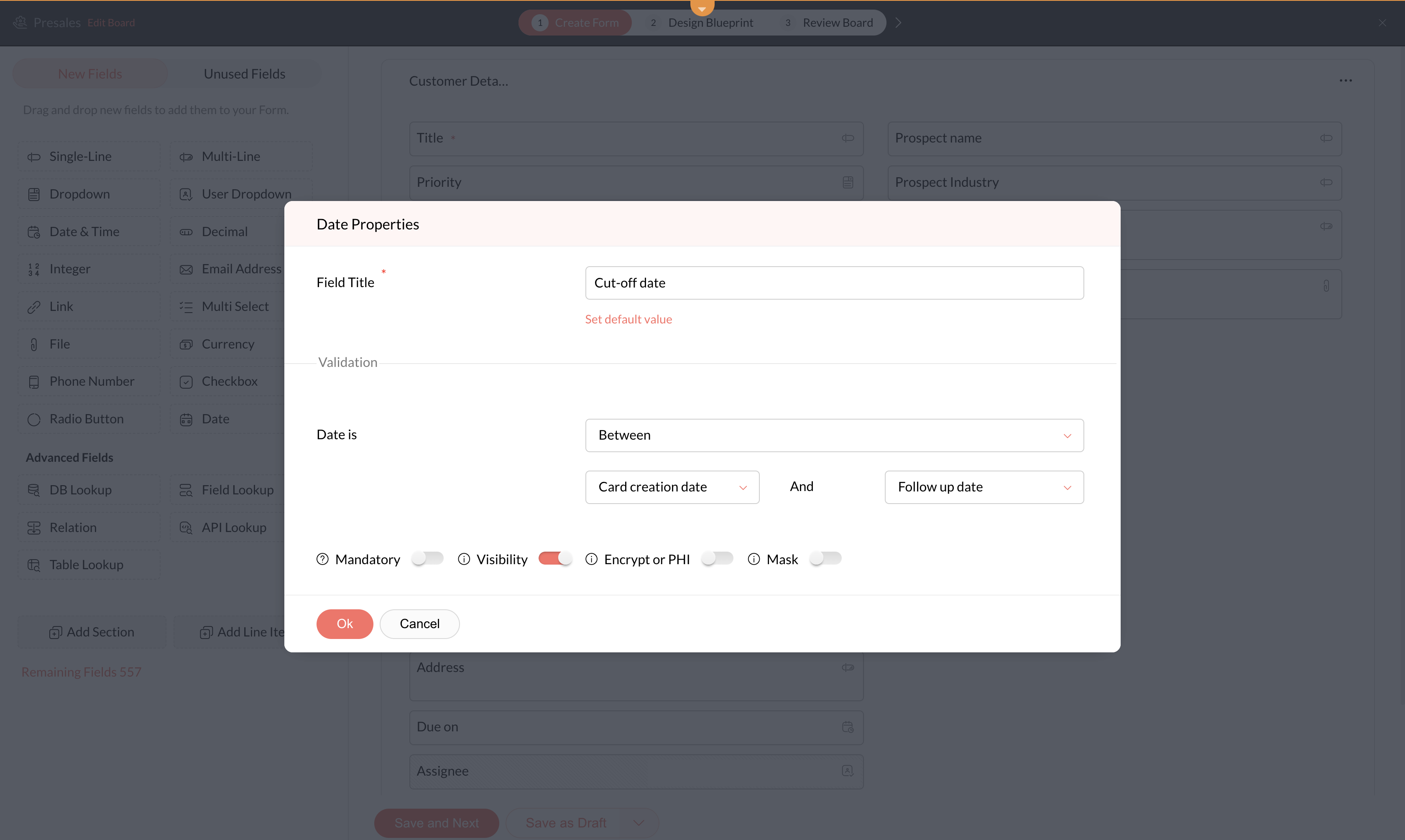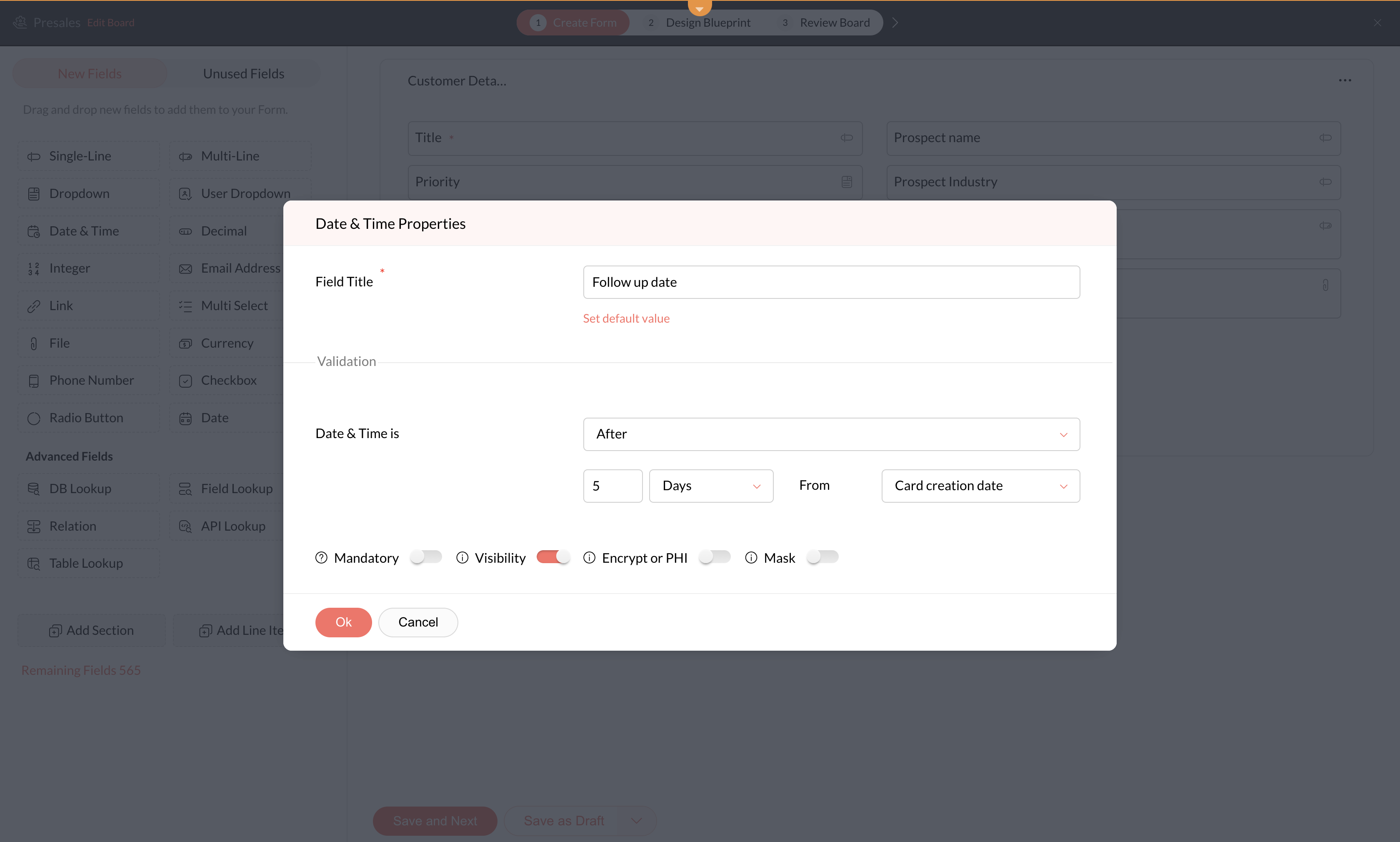 - Set criteria to validate the date that is entered by the user. For instance, the due date & time of a card can only be in the future. So you can set the criteria as: Date & Time is After 5 days From Card Creation date.