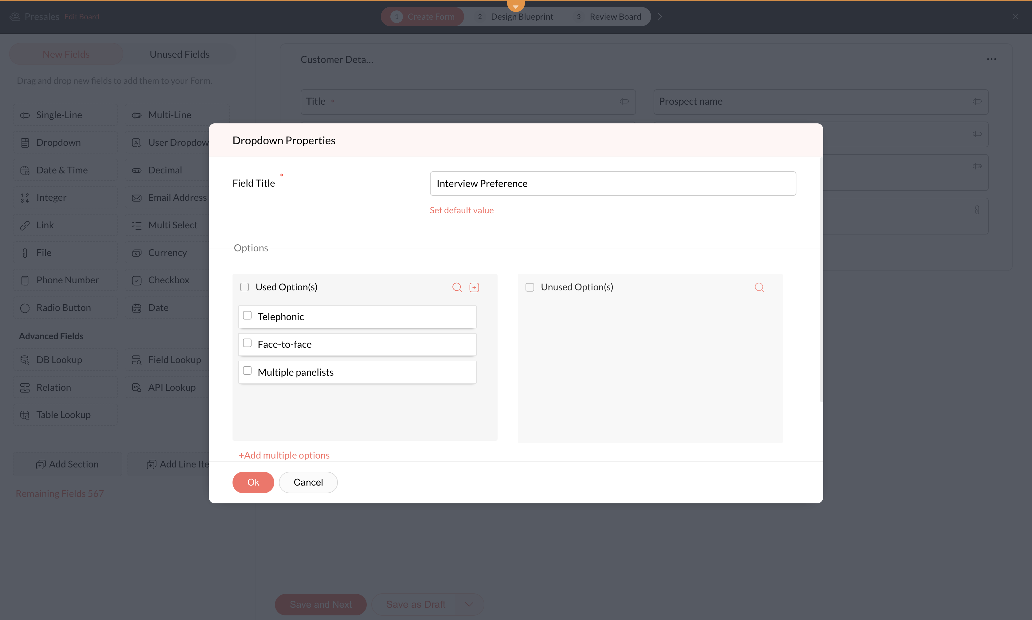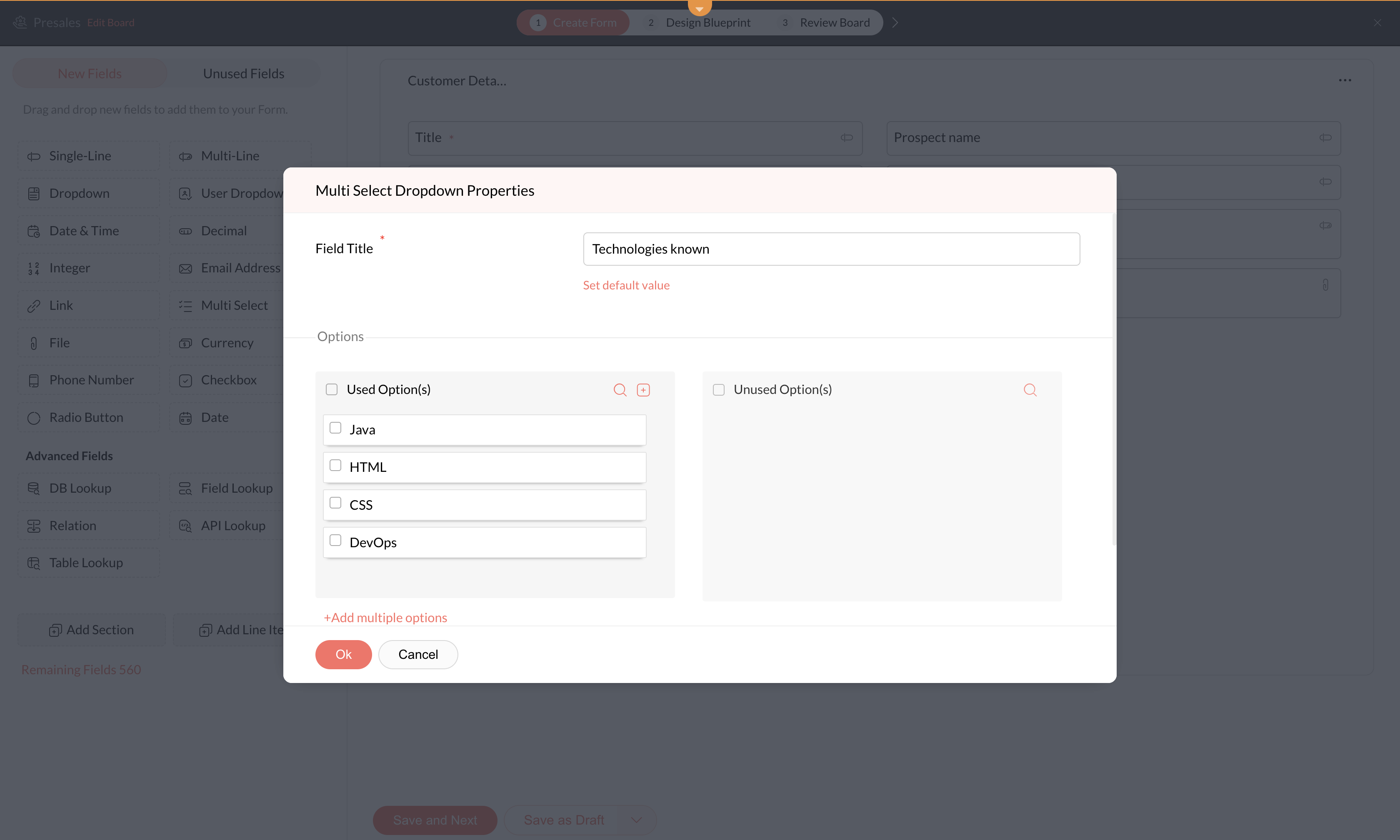 - Drag and drop the Multi Select field from the New Fields tray onto the right panel.