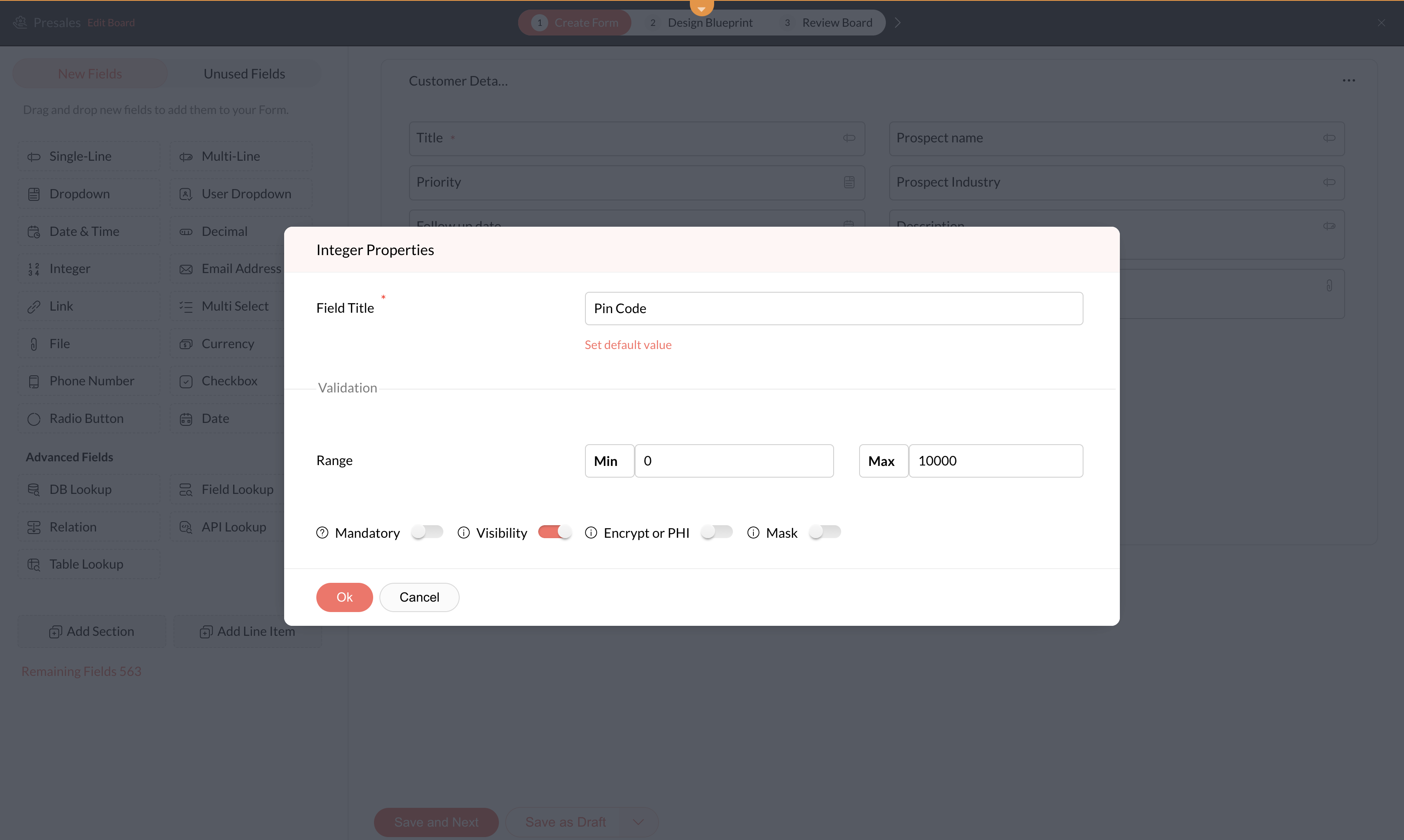 - Range: Enter the minimum and maximum limit for integer value that the user can enter.
